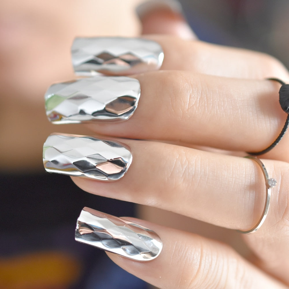 Mirror Metal Square Short Nails Silver Squat Gorgeous Beauty Fake Nails Reflective Artificial Press On Nails-Nail Inspo