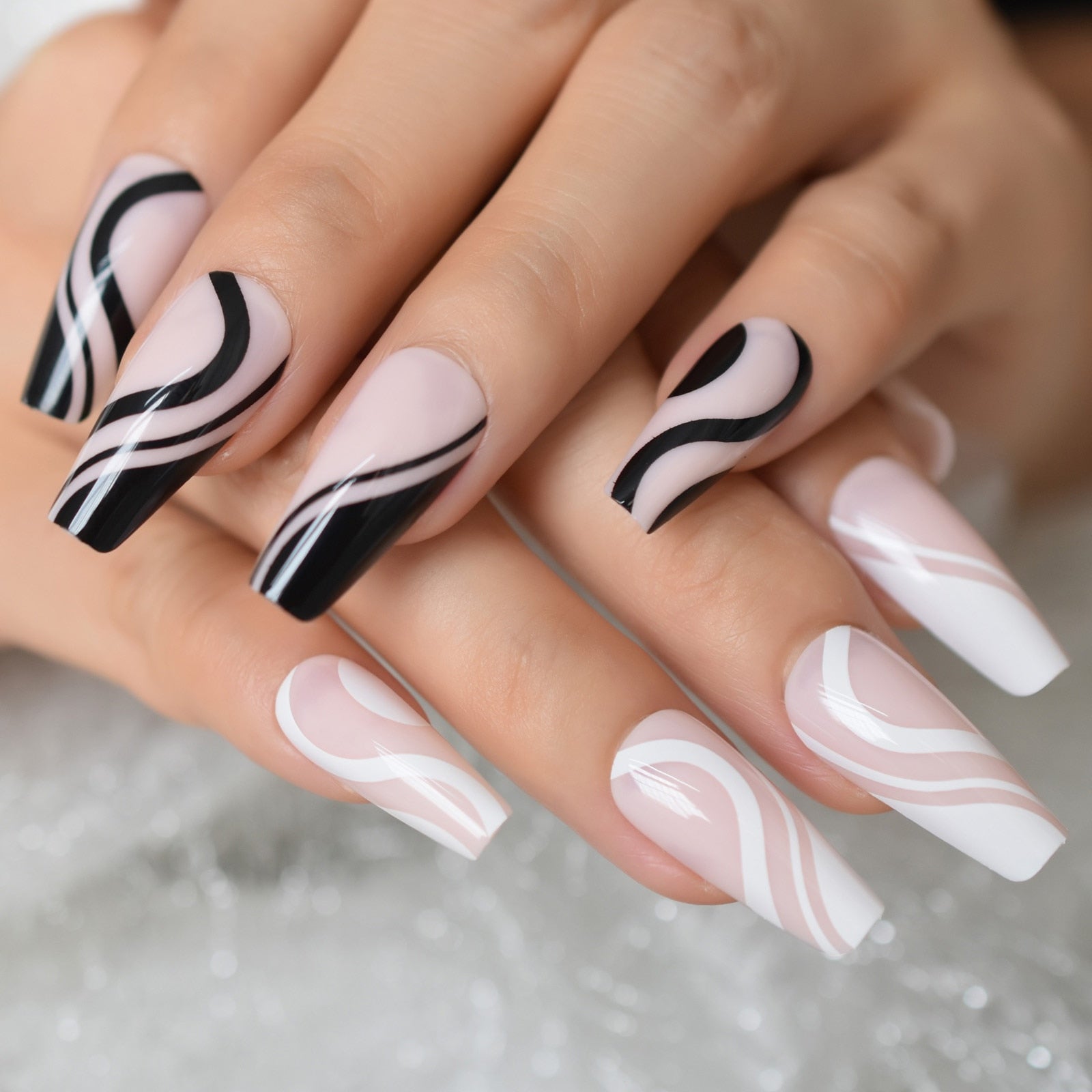 Mixed 12pcs White 12 Pcs Black Curve Line Pre Designs Medium Coffin Full Cover Nail Press On Fingernail Art Wholesale Reuseable-Nail Inspo