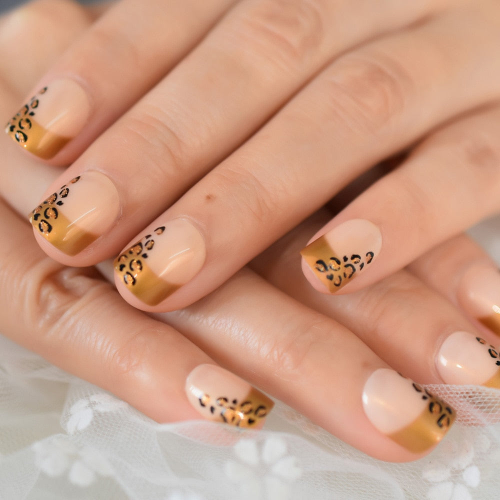 Multi-color Short Square False Nails Golden Fringe Press On Nails Tips Adorn With Gold Glitter Fake Nails Leopard Pattern-Nail Inspo