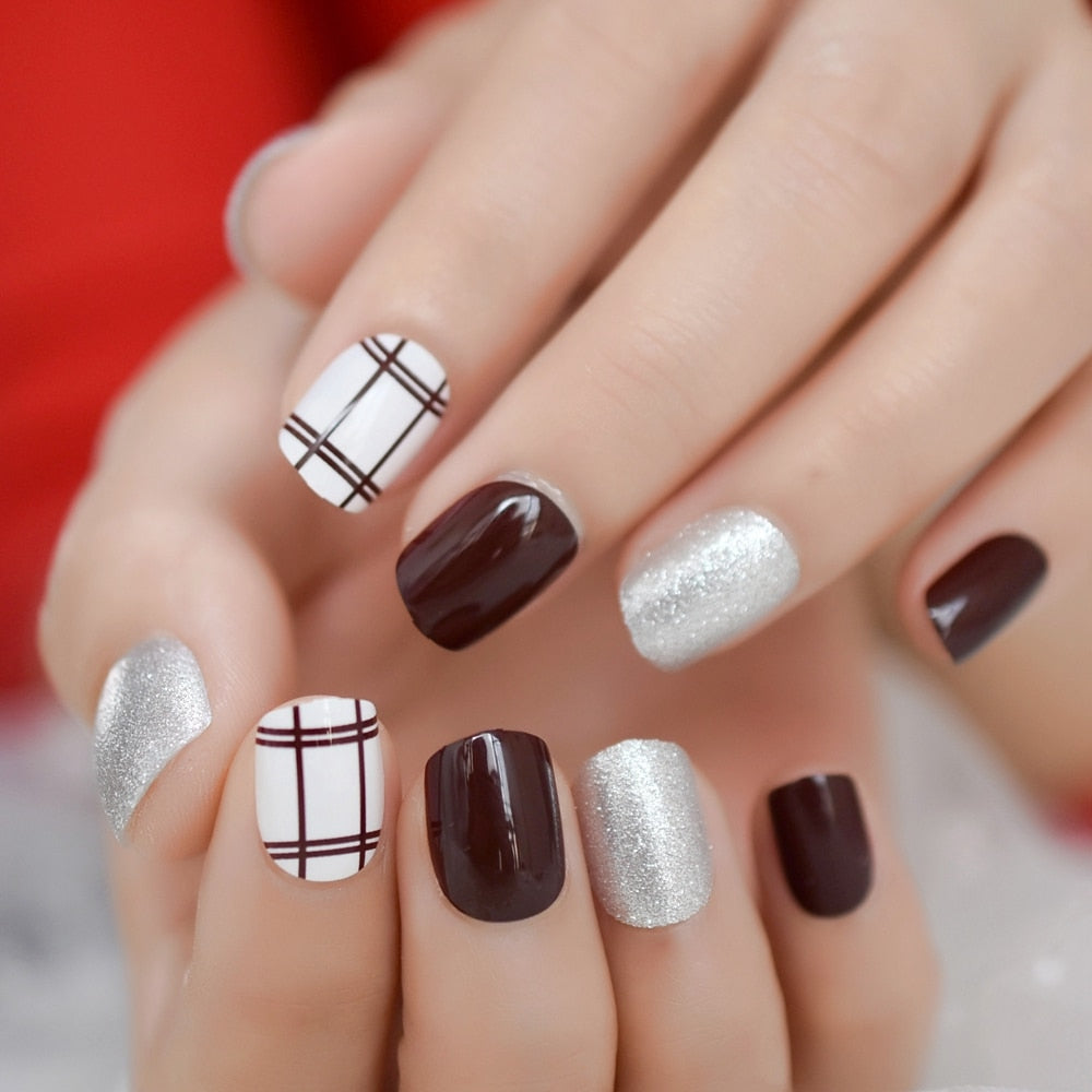 Multi-designed False Nails Straight Line ABS Artificial Nail Gleaming Silver Glitter Finger Nail Art Tips for Office Lady-Nail Inspo