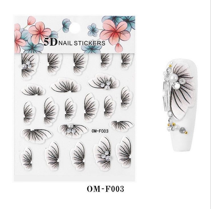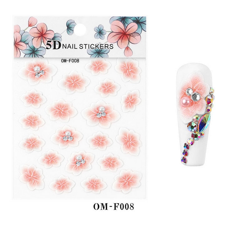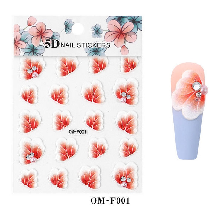 Nail Stickers Embossed 5D Flowers With Pearls Rhinestones Back Glue Nail Decals Decoration Tips For Beauty Salons-Nail Inspo
