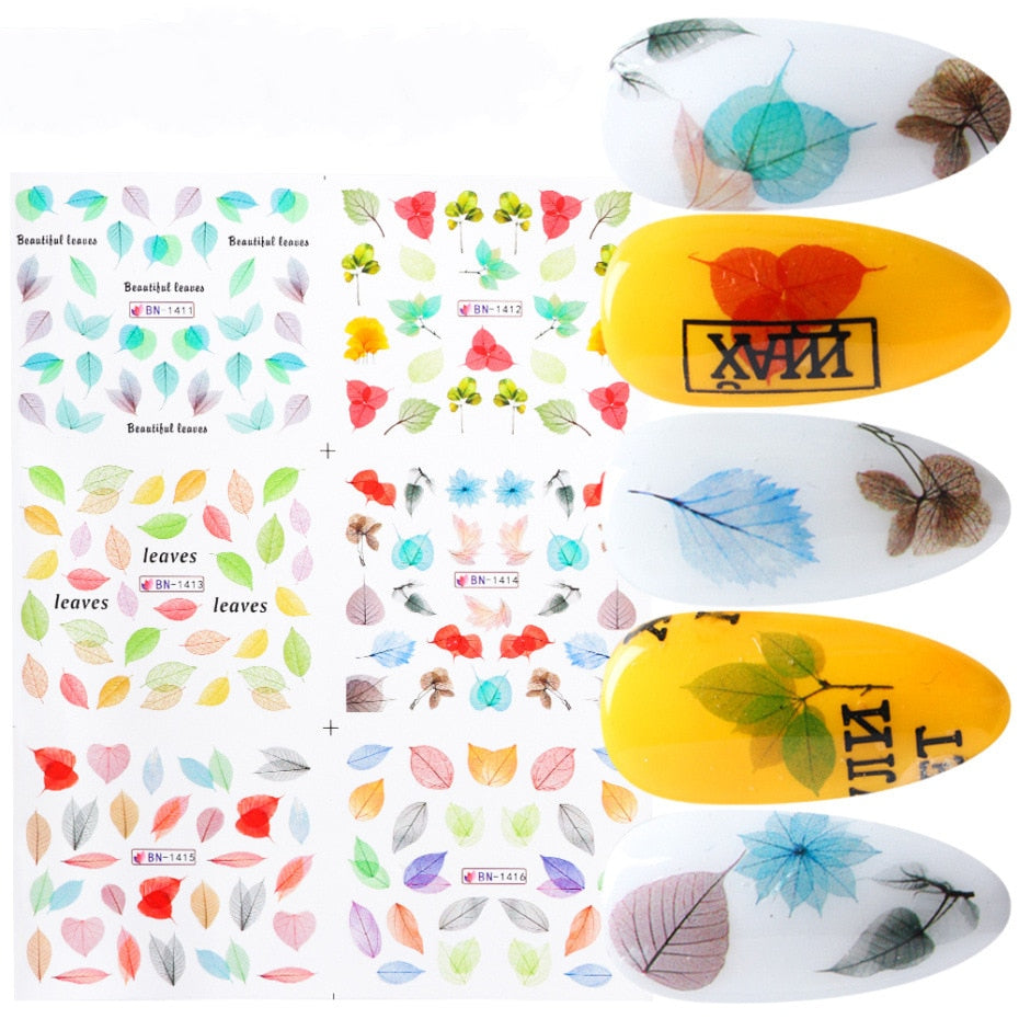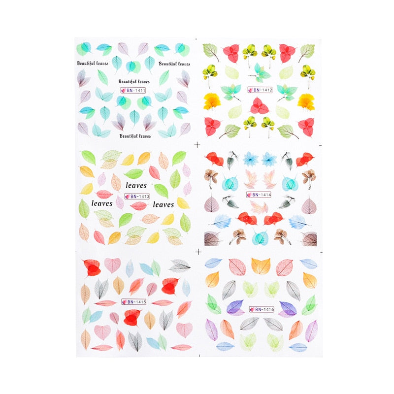 Nail Stickers Water Transfer Colorful Clear Leafs Designs 6Pcs/Set Nail Decal Decoration Tips For Beauty Salons-Nail Inspo