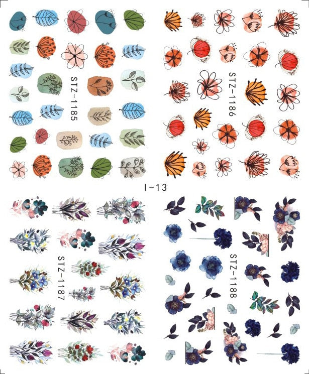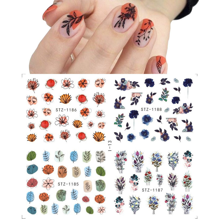 Nail Stickers Water Transfer Flowers Leafs Abstract Art Designs 4Pcs/Set Nail Decal Decoration Tips For Beauty Salons-Nail Inspo