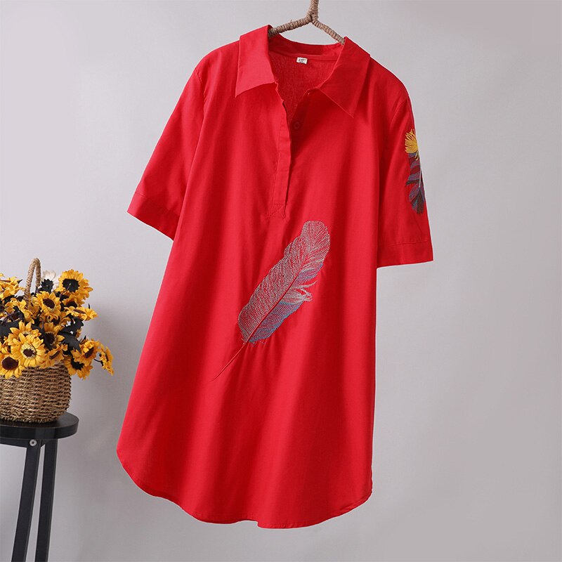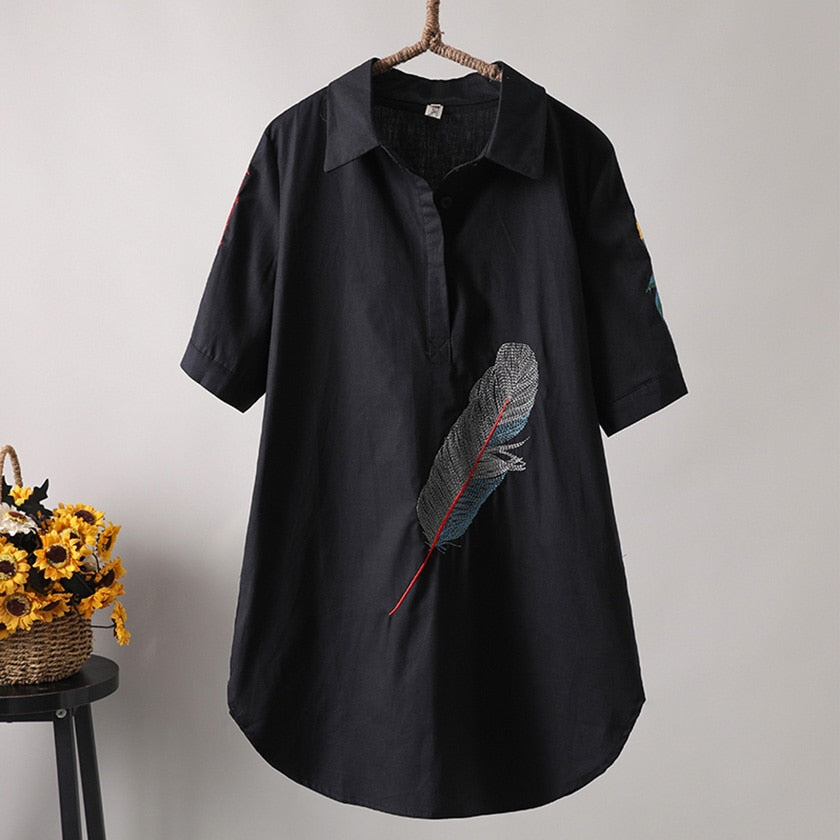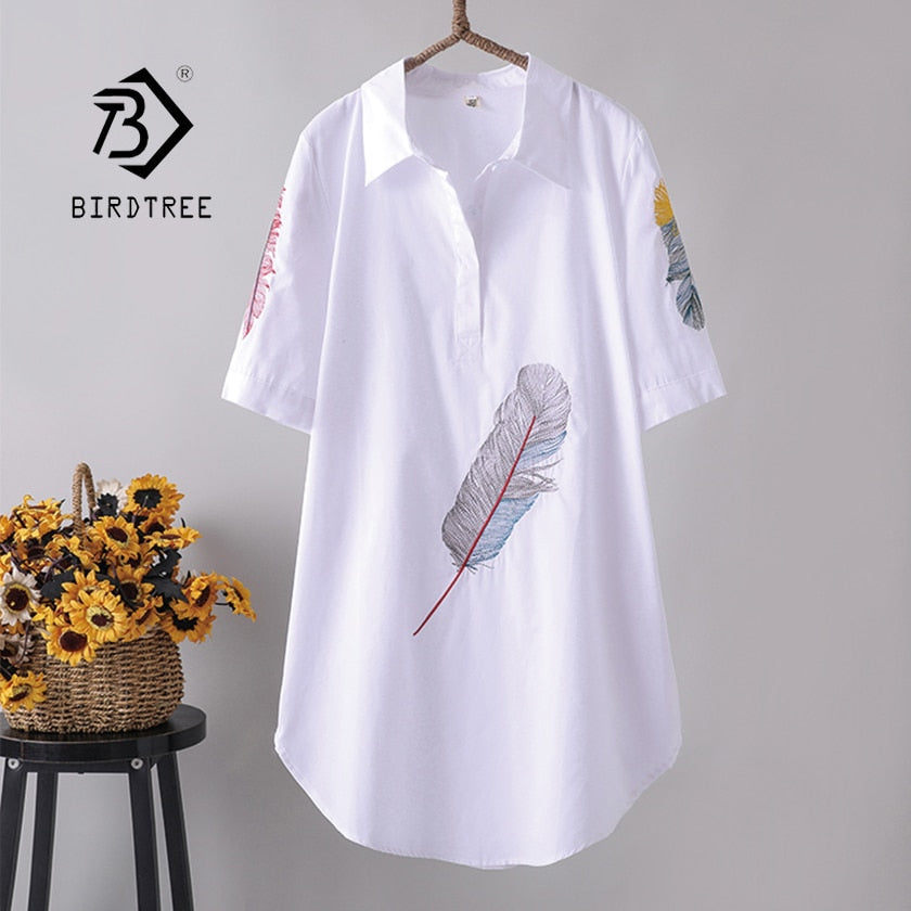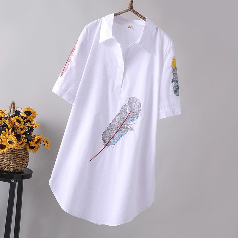 New Arrival Women Feather Embroidery Long Cotton White Blouse Summer Short Sleeve White Female Shirt Turn-Down Collar Top T96401