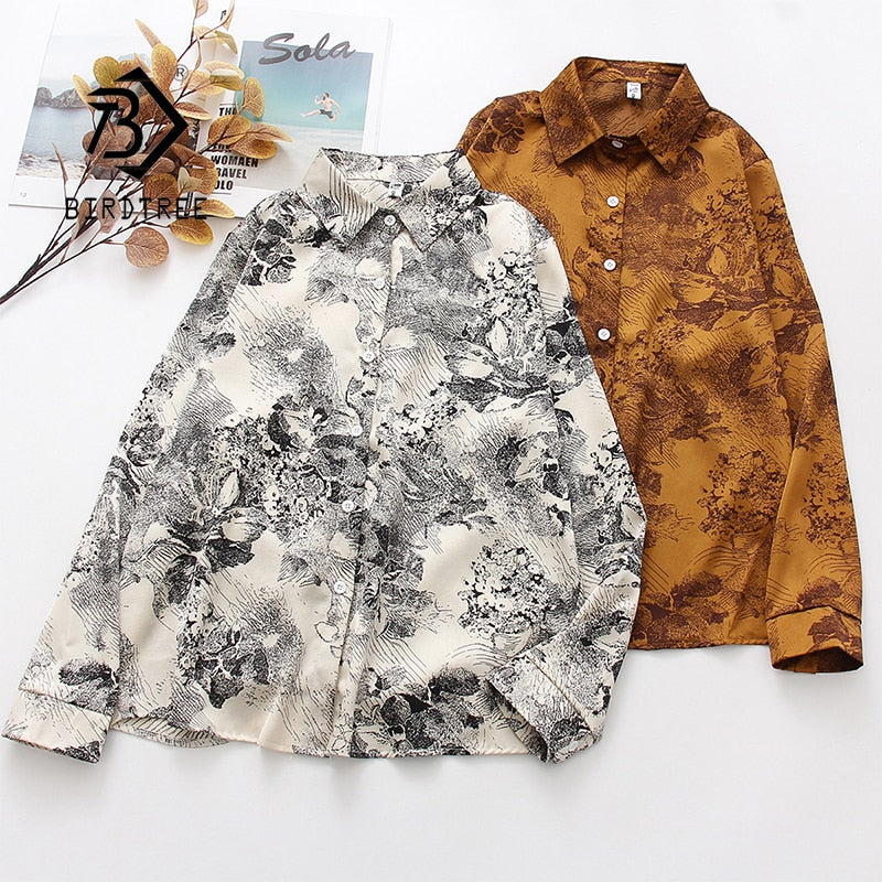 New Women Vintage Ink Painting Print Chiffon Blouse Full Sleeve Button Up Turn Down Collar Shirt Casual Office Lady Autumn Tops