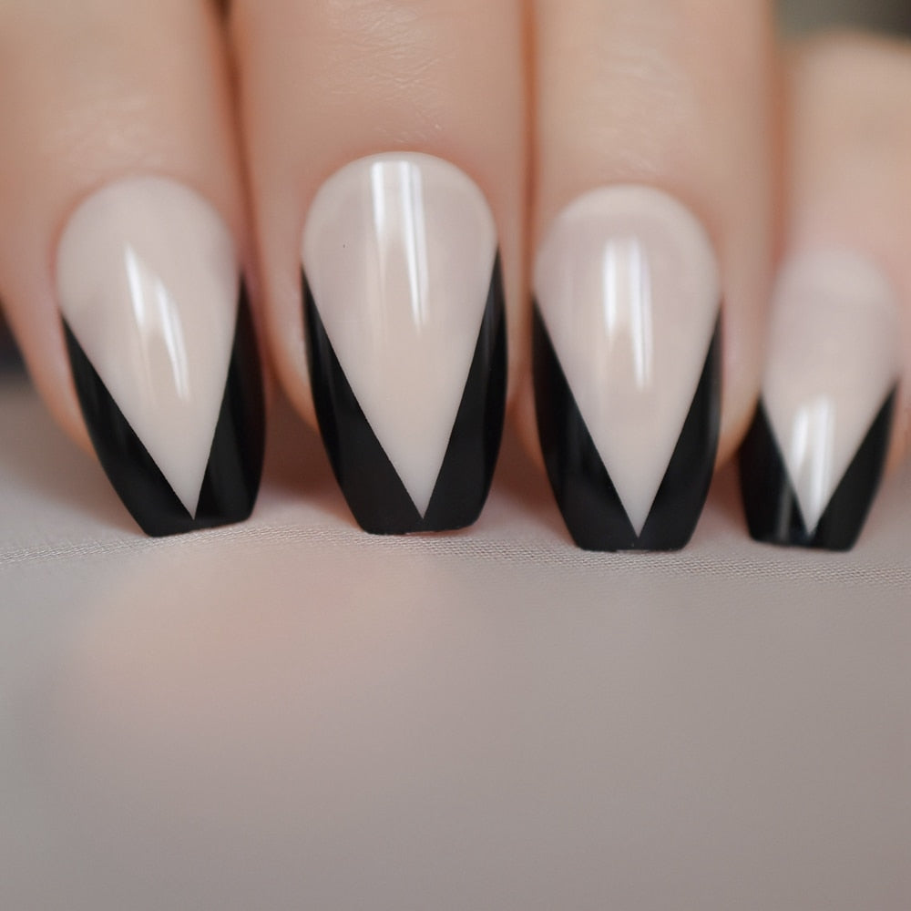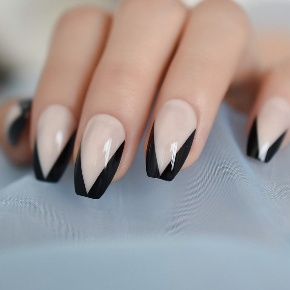 Nude Color French Nail Mixed Black V Shape Fake Nails gel Polish Coffin Nails with Adhesive Tabs 24 PCS-Nail Inspo
