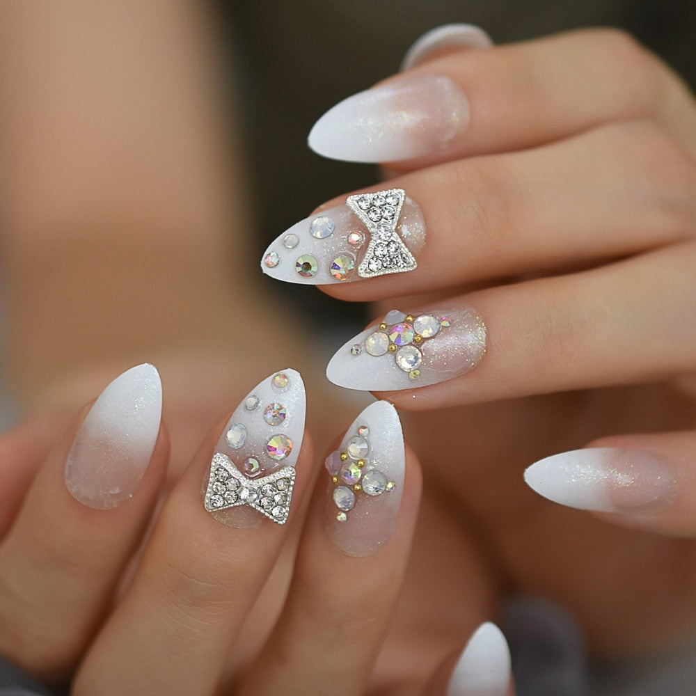 Ombre Glitter Faux Ongles White French Tips Stiletto Custom Deisgner False Nails with Rhinestones Bowknot Decoration-Nail Inspo