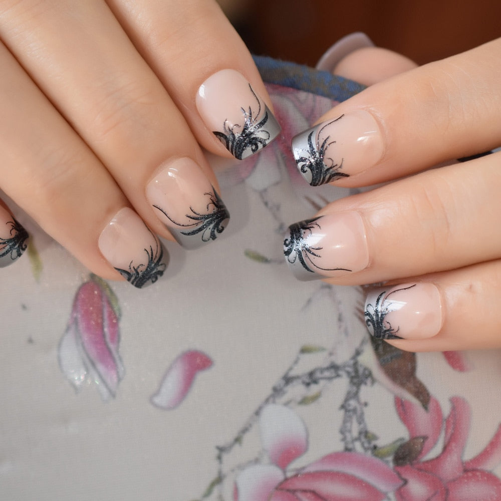 Plastic False Nail Tips Square Artificial Short French Fake Nails With Black Clear Flower Pattern Decoration Design-Nail Inspo