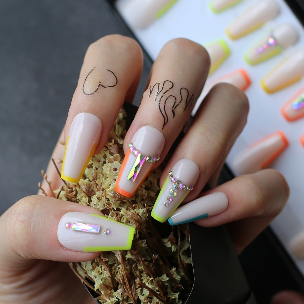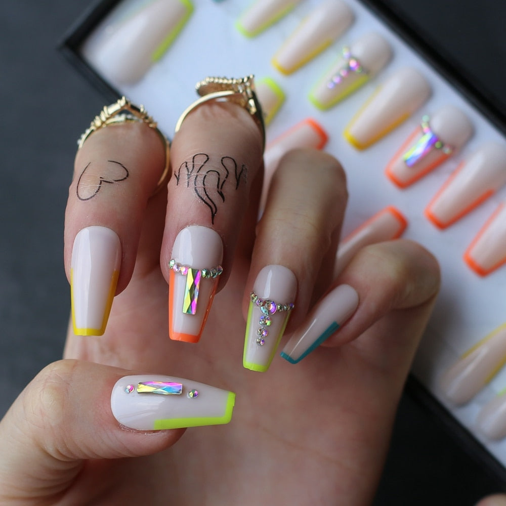 Rainbow nails Gel Coffin False Nails Press On Gift Box Handmade Rhinestone art Ballet Fake nails-Nail Inspo