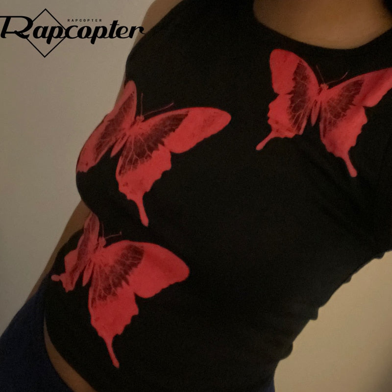 Rapcopter Butterfly y2k Printed Tank Tops Vintage Corset Top Sleeveless O Neck Crop Top Women Summer Skinny Camis 90s Harajuku