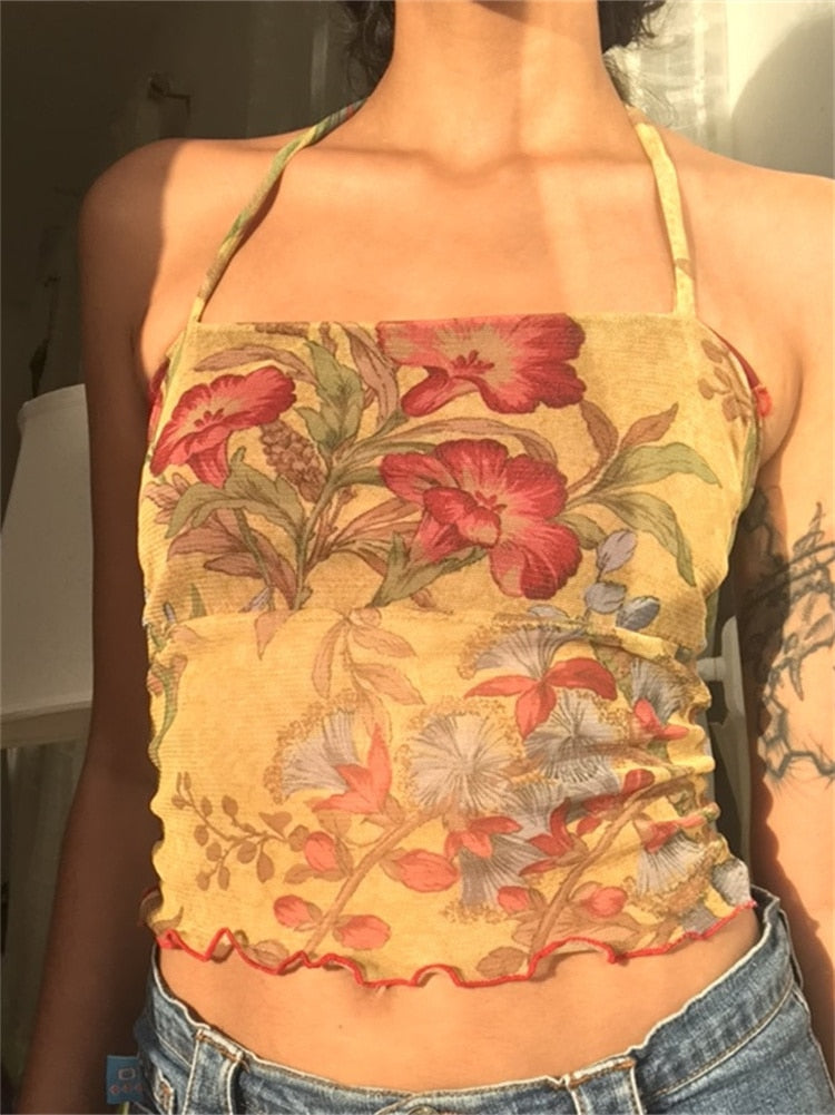 Rapcopter Floral y2k Crop Top Mesh See Through Sexy Corset Top Frill Cross Halter Sweats Female Summer Party Clubwear Cute Vests
