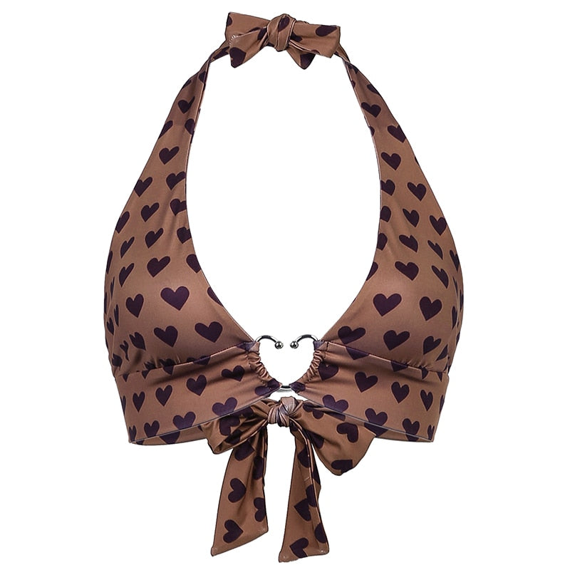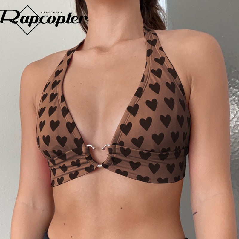 Rapcopter Heart Printed Crop Top y2k Sweet Tank Top Metal Tie Up Croset Women Halter Top V Neck Sexy Sweat Summer Beach Style
