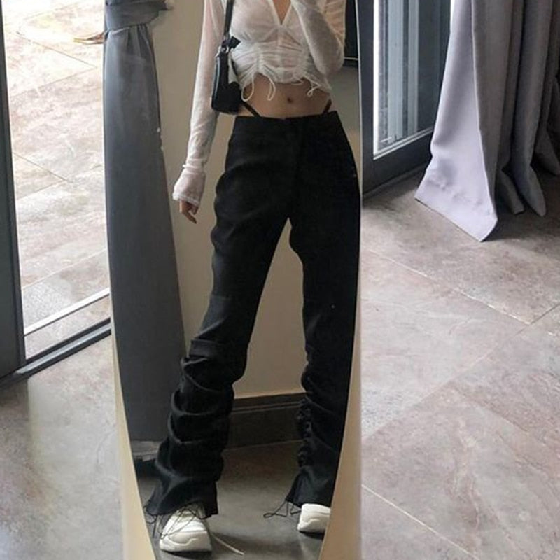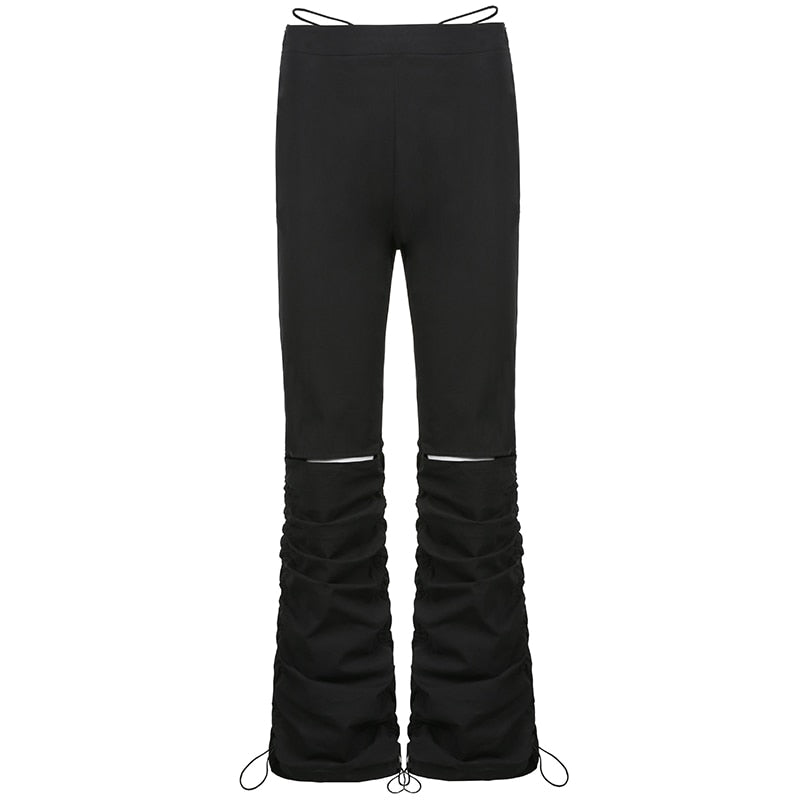 Rapcopter Hollow Out Pants Y2K Ruched Drawstring Trouser High Waist Cargo Pants Bandage Patchwork Pants Casual Women Streetwear