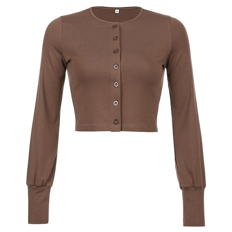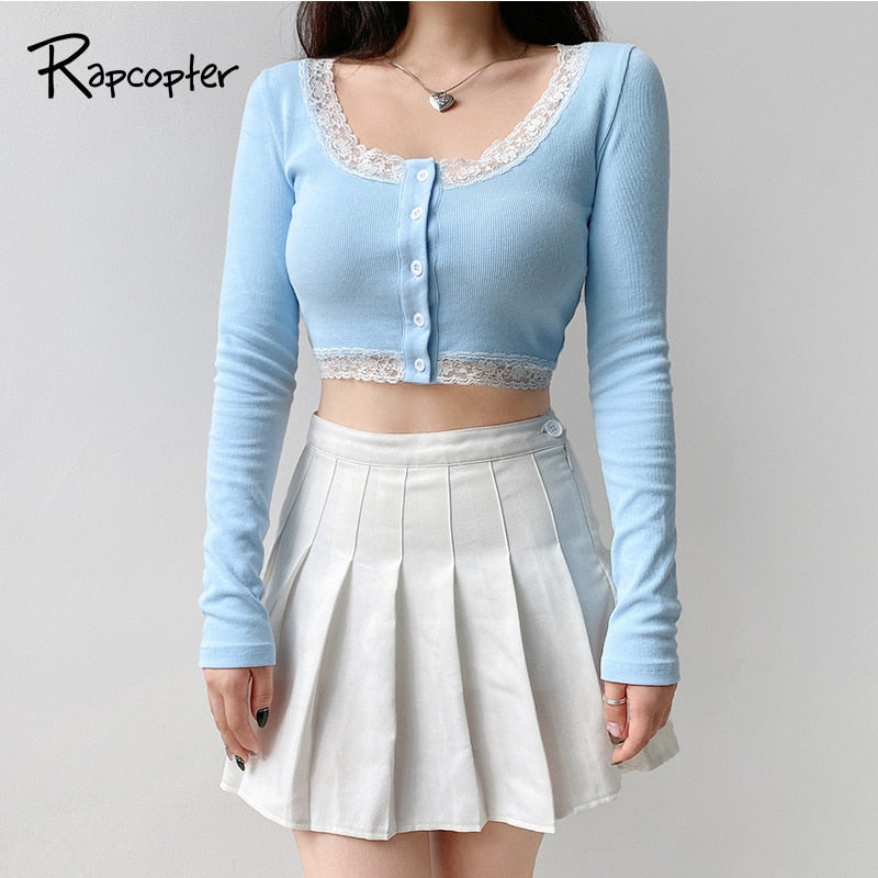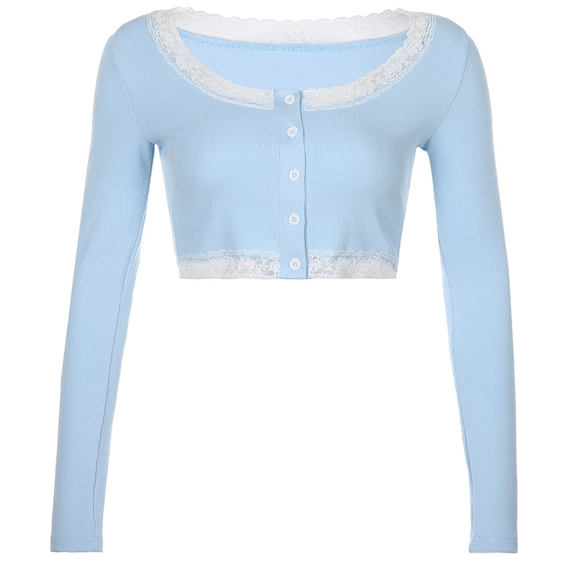 Rapcopter Lace Patchwork Crop Top Women T Shirts Knitted Slim Tee Tops Button Cardigan Blue Cute Tshirt Autumn Long Sleeve Tops