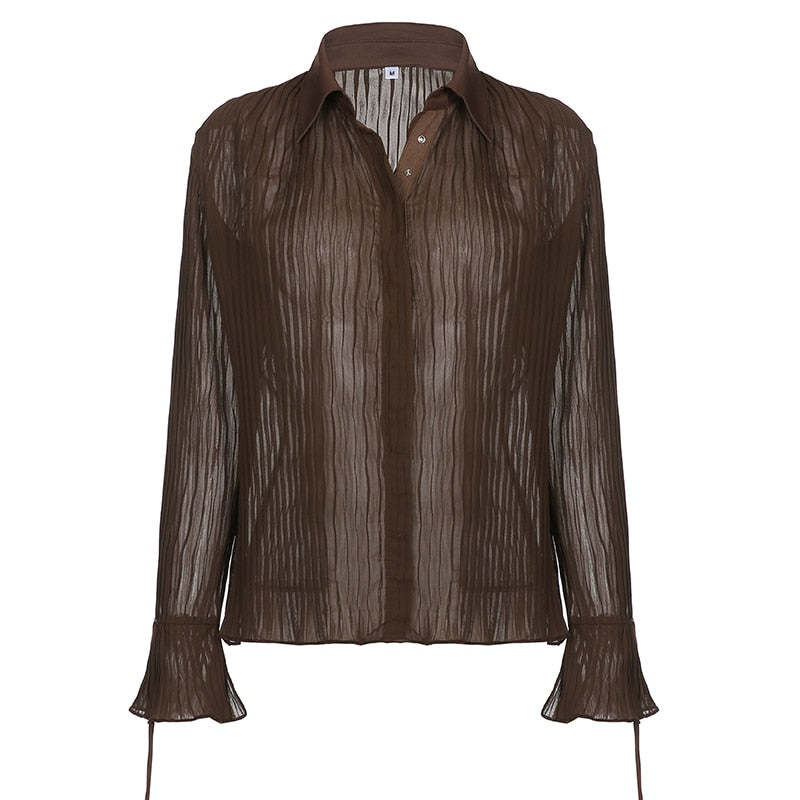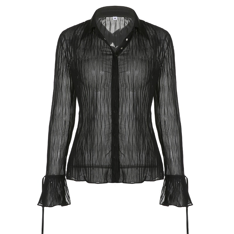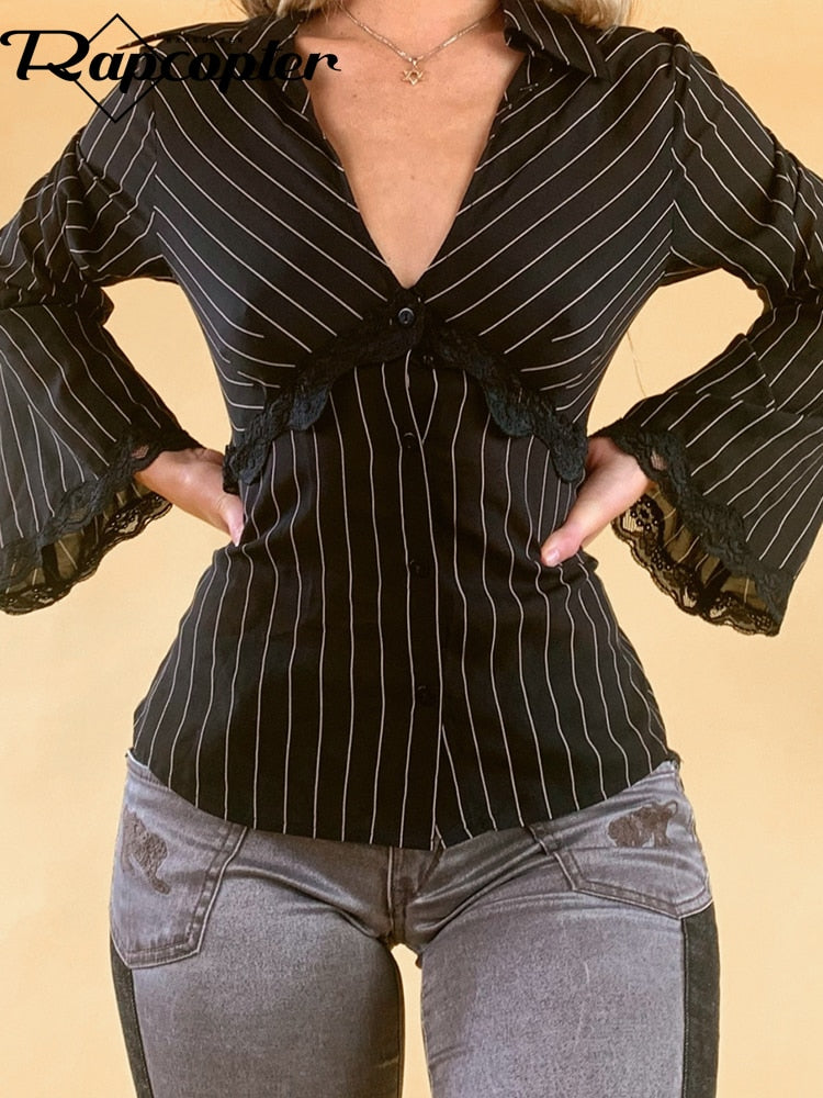 Rapcopter Lace Striped T Shirt V Neck Button Elegant Crop Top Vintage Skinny Flare Sleeve Cardigans Women Grunge Korean Tee Fall