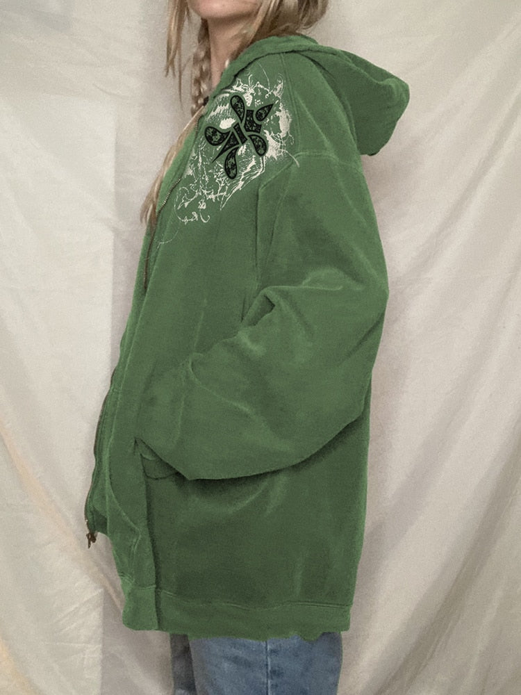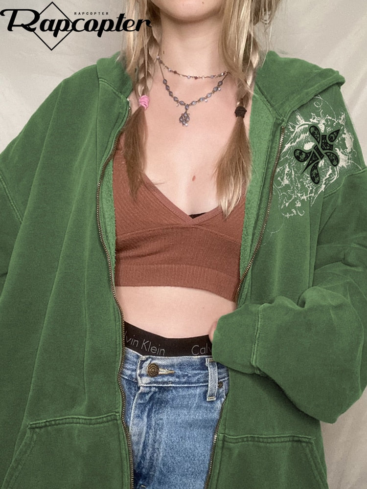 Rapcopter Printed y2k Jackets Grunge Fairycore Zipper Hooded Coat Pockets Loose Retro Kawaii Outerwear Women Korean Harajuku 90s
