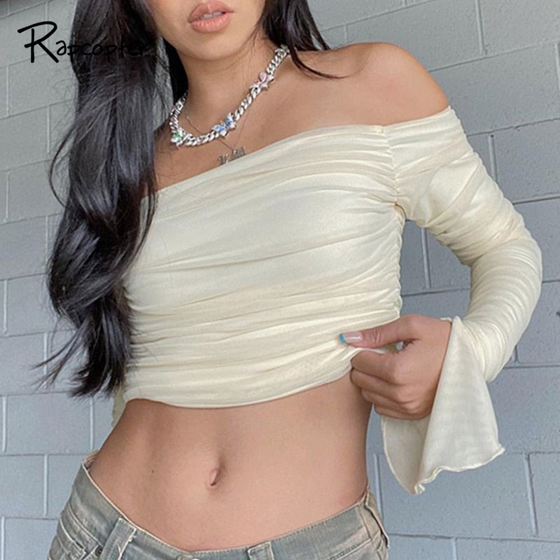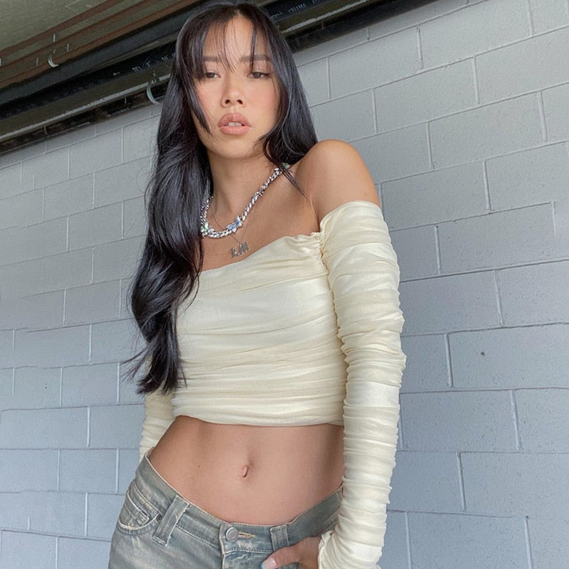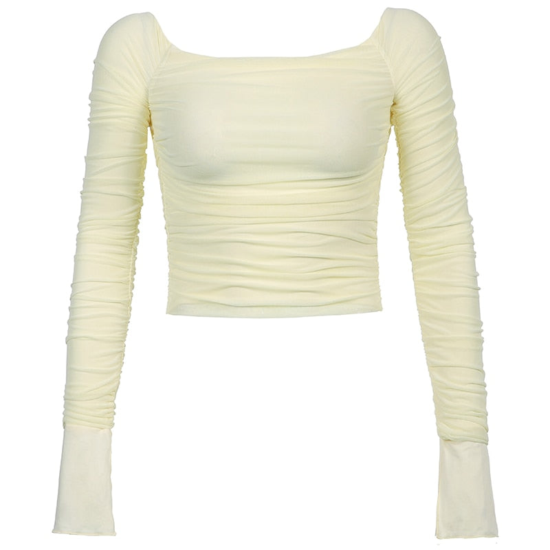 Rapcopter Ruched Mesh Crop Top Slash Neck Sexy T Shirt Y2K Split Long Sleeve Pullovers Cream Yellow Women Autumn Party Clubwear