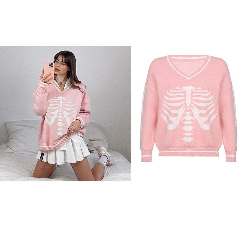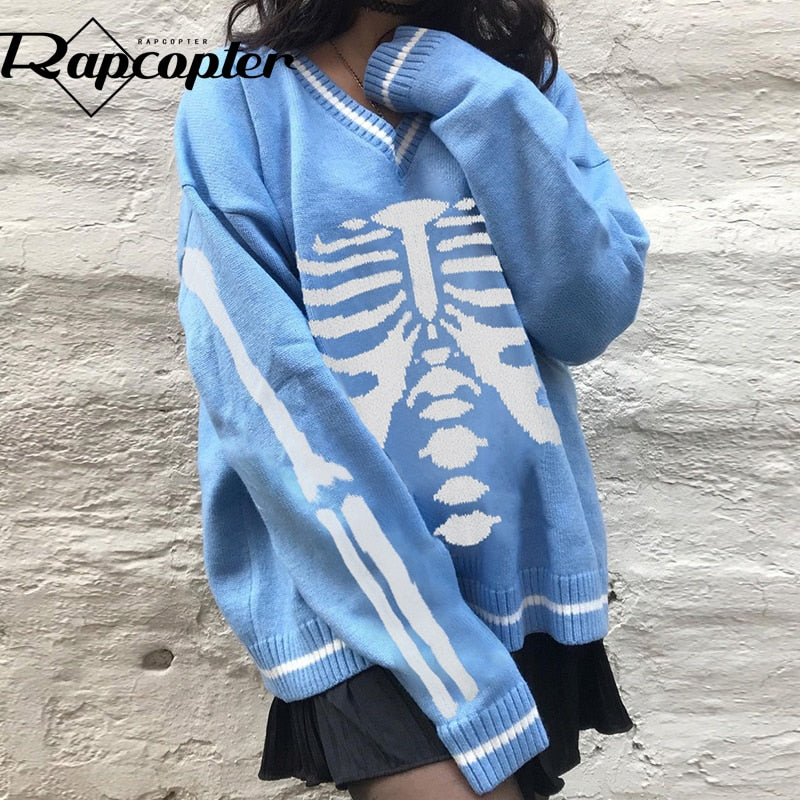 Rapcopter Sweaters Skulls Pullovers V Neck Knitwear Loose Casual Knitted Jumpers Women Streetwear Retro Tops Autumn Winter Cute