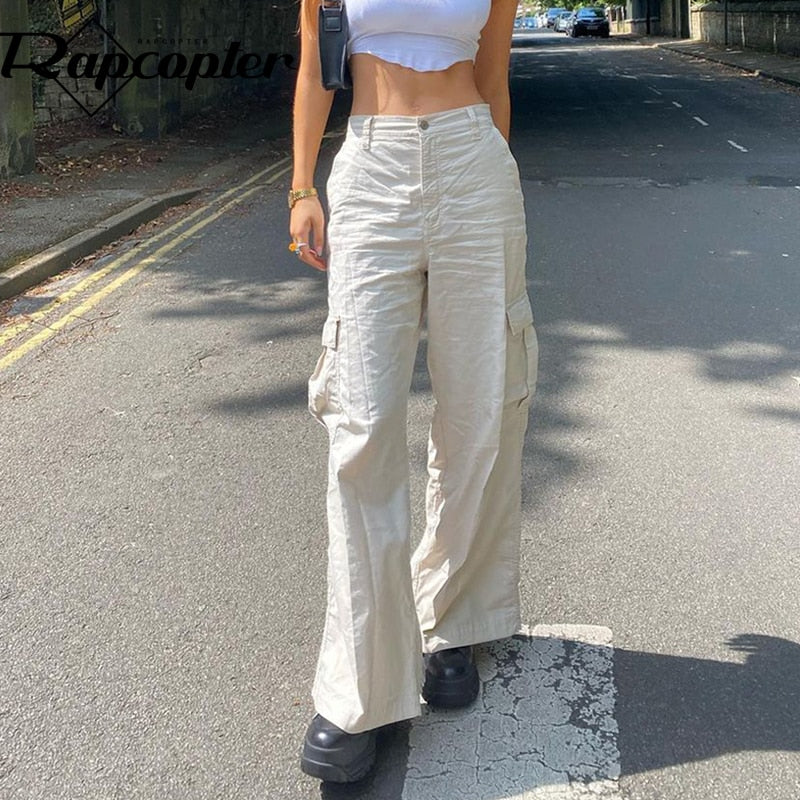 Rapcopter White y2k Cargo Pants Big Pockets High Waisted Joggers Vintage Casual Baggy Sweatpants Women Korean Trousers Grunge