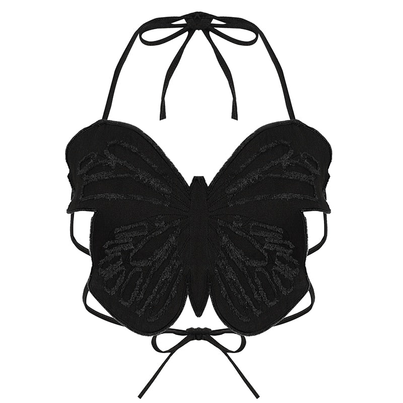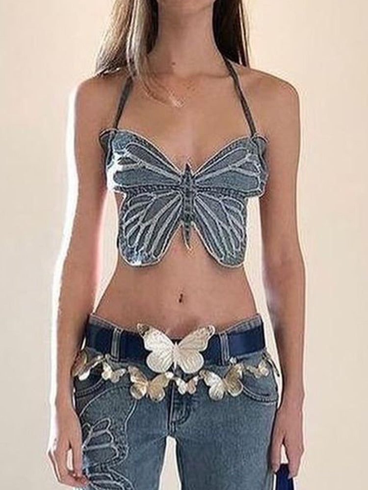 Rapcopter y2k Butterfly Jeans Crop Top Backless Strap Camis Sexy Blue Cute Party Sweats Women Beach Holiday Mini Vest Summer Tee