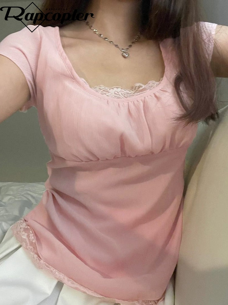 Rapcopter y2k Chiffon Crop Top Lace Trim Short Sleeve T Shirt O Neck Cute Sweet Pullovers Women Pink Summer Fairycore Basic Tee