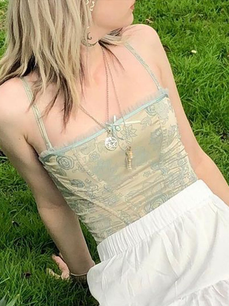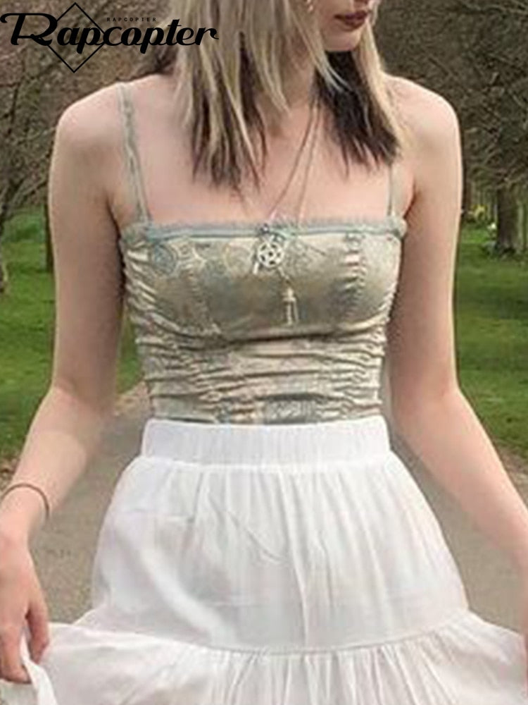 Rapcopter y2k Floral Cop Top Frill Cute Sweet Corset Top Patched Vintage Camis Women Party Holiday Chic Sweats Grung Fairycore