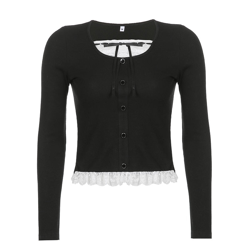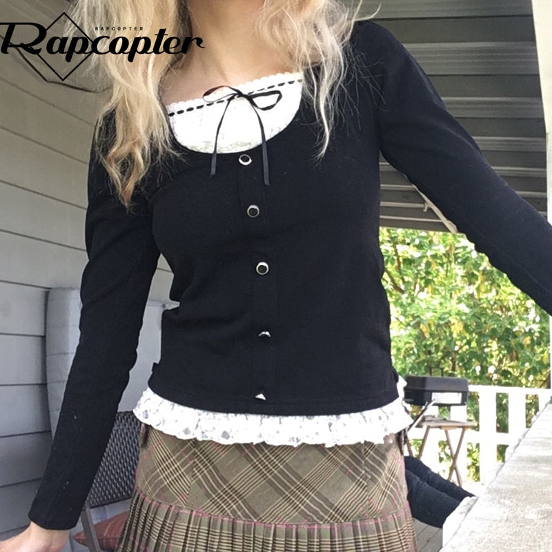 Rapcopter Y2K Frill Crop Top Bow Full Sleeve T Shirt Kawaii Black Button Pullovers Autumn Retro Harajuku Chic Tee Women Sweet