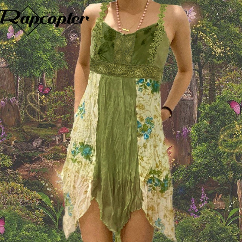 Rapcopter y2k Green Pleated Dress Floral Grunge Fairycore Kawaii Sweet Party Dress Tie Up Frill Strap Boho Mini Dress Women Chic