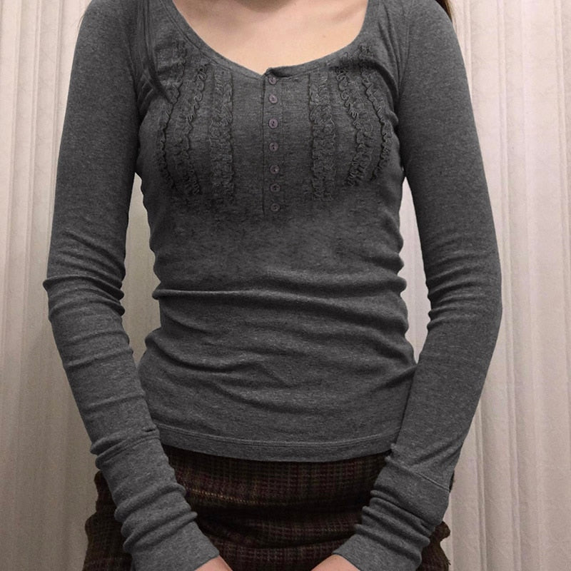 Rapcopter y2k Grey Frill Crop Top Cute Retro Button T Shirt Harajuku Solid Casual Basic Tee Slim Women Grunge Fairycore Clothes