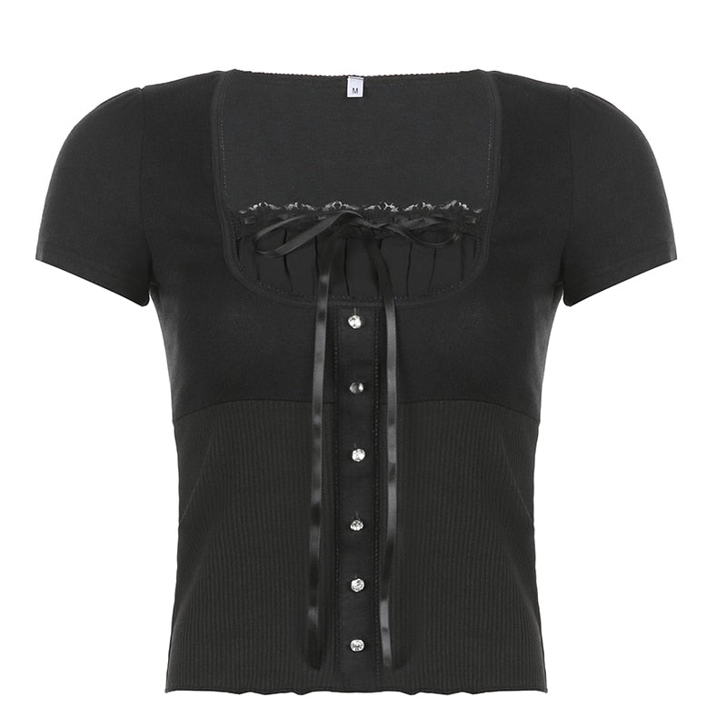 Rapcopter y2k Laec Bow Button Crop Top Knitted Square Collar Short Sleeve T Shirt Cute Sweet Summer Tee Women Prepply Korean Top