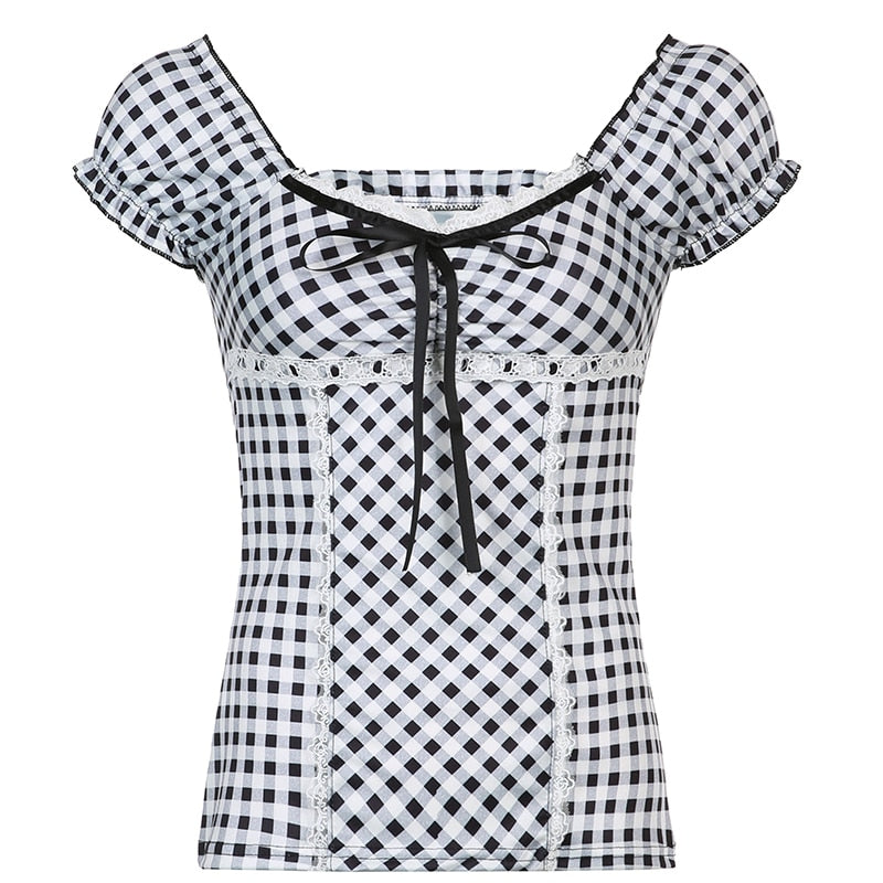 Rapcopter y2k Plaid Crop Top Frill Bow Cute Sweet T Shirt Short Sleeve Square Collar Vintage Prepply Tee Women Fairycore 2022