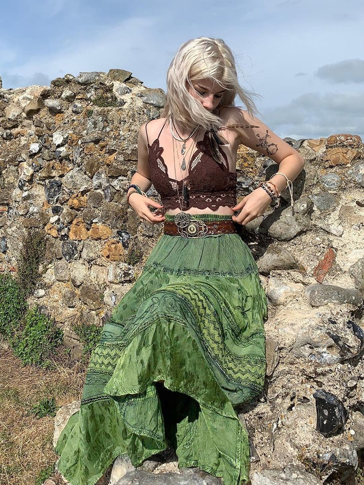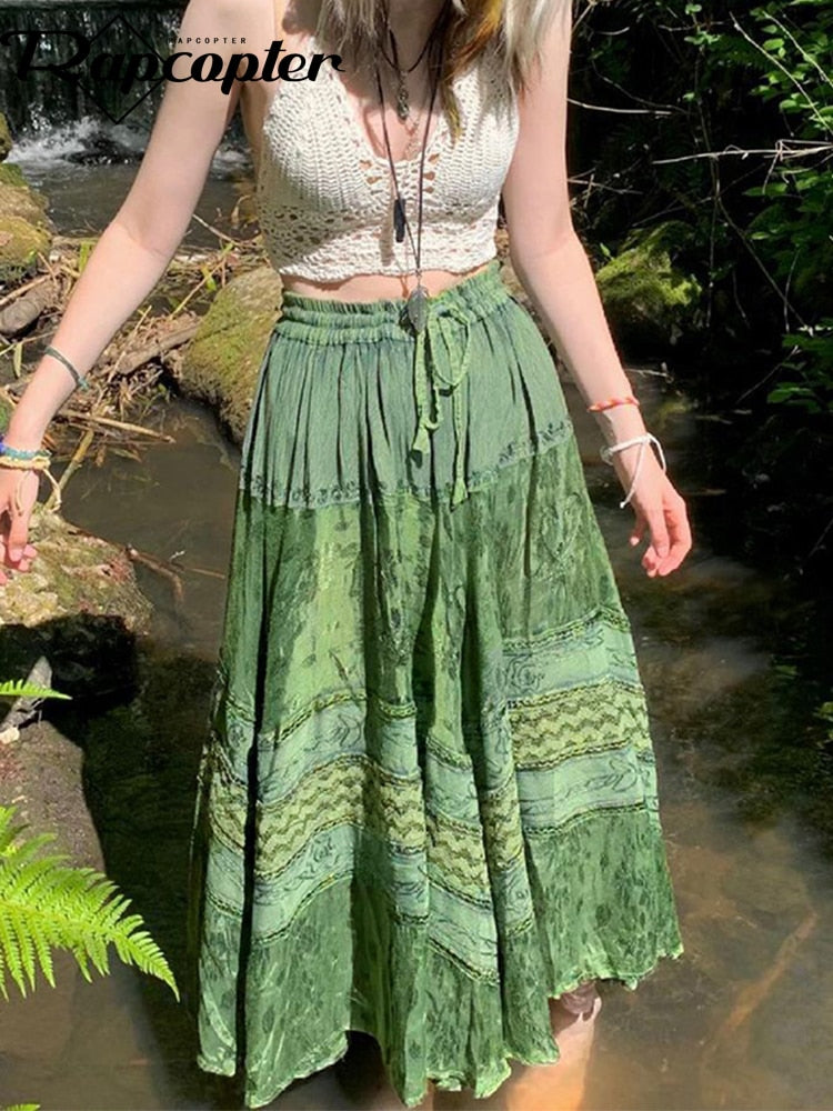 Rapcopter y2k Printed Green Long Skirts Retro Kawaii Lace Up Pleated Skirts Grunge Fairycore Boho Beach Holiday Skirt Women Chic