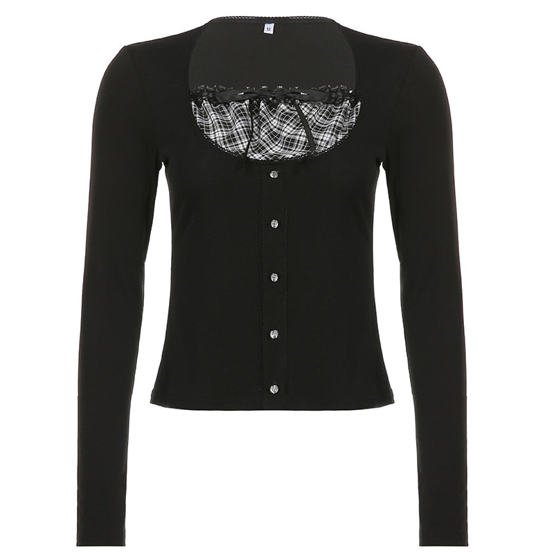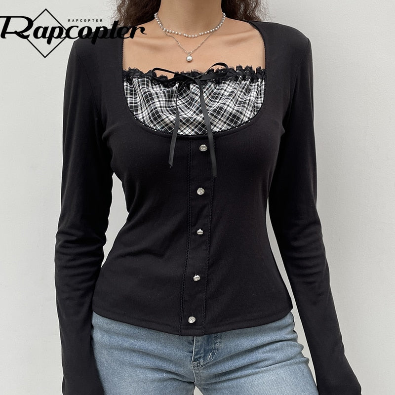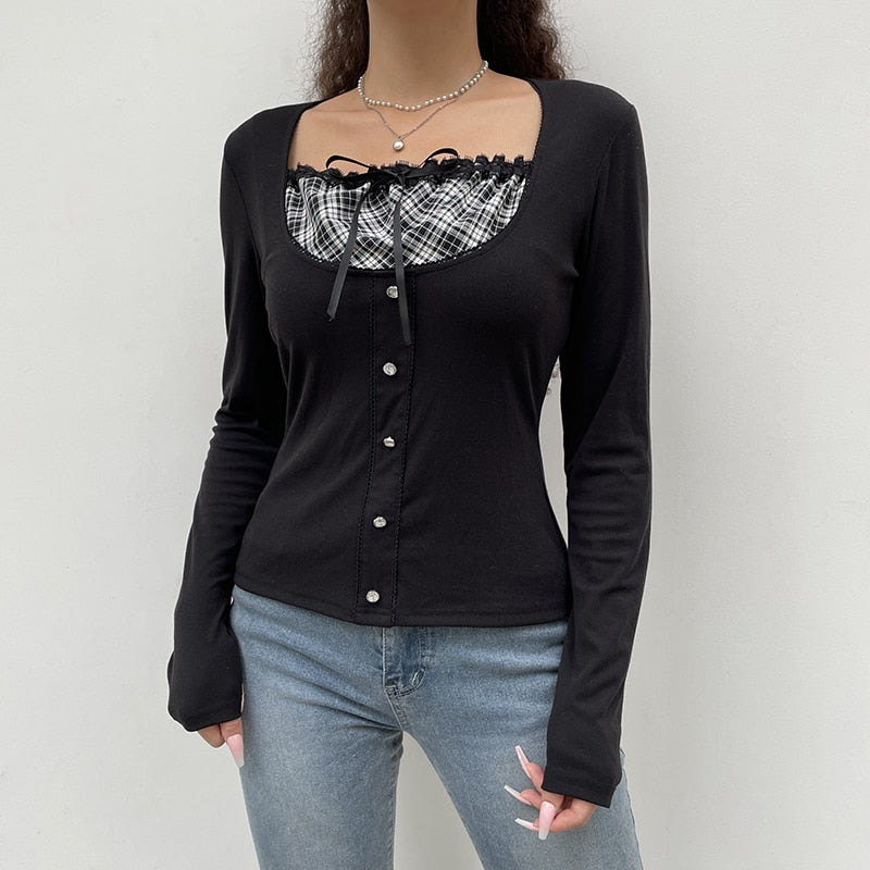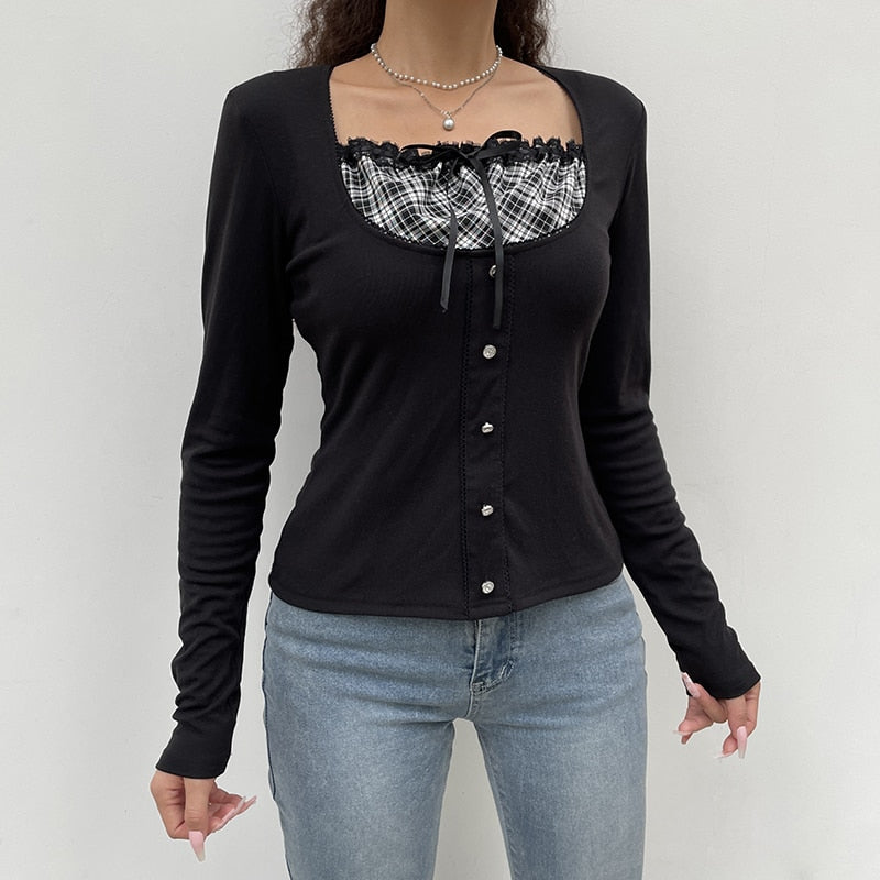 Rapcopter y2k Striped Frill Crop Top Bow Cute Sweet T Shirt Long Sleeve Square Collar Button Tee Vintage Casual Women Pullovers