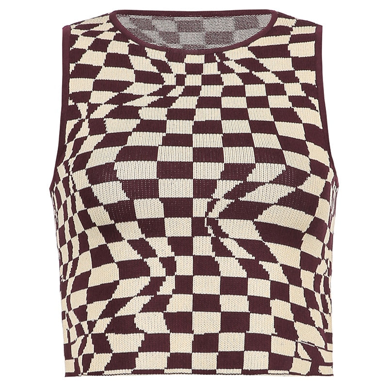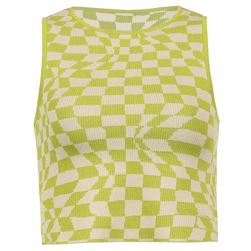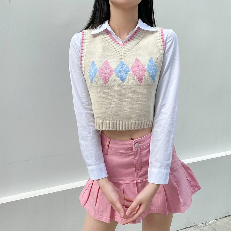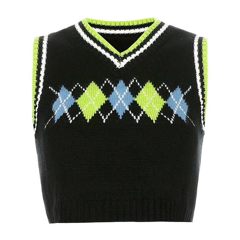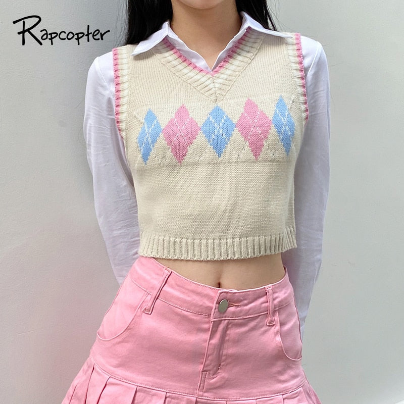 Rapcopter y2k Sweaters Plaid Patched Knitwear Sleeveless V Neck Knitted Tank Top Preppy Style Pullovers Crop Top Autumn Women