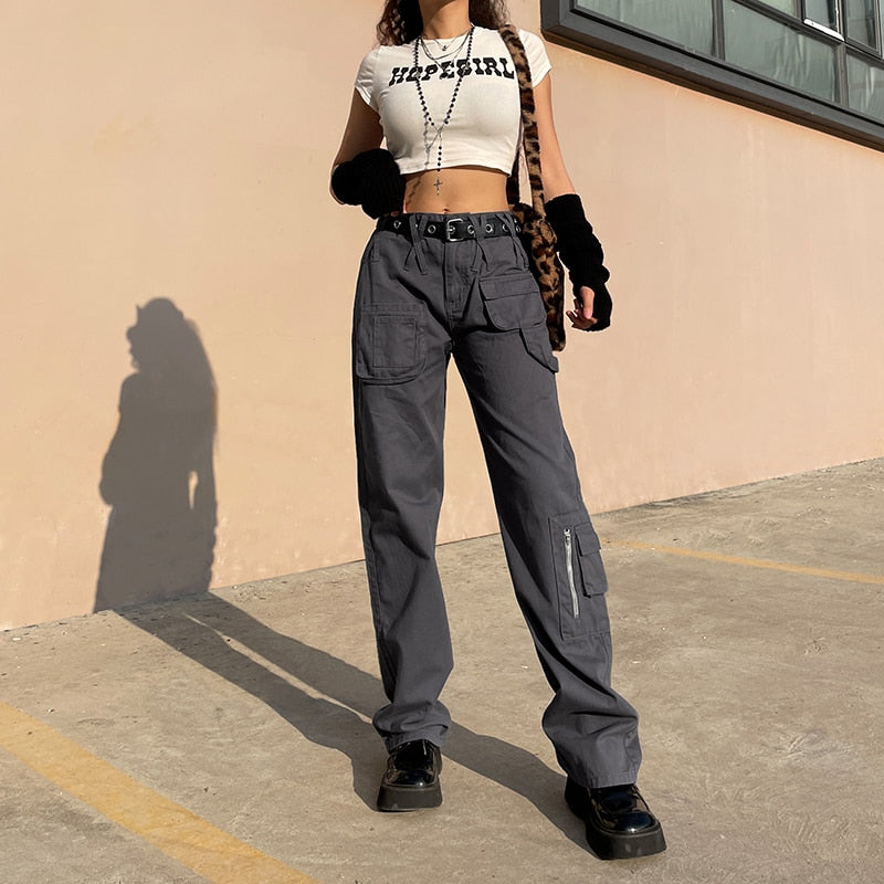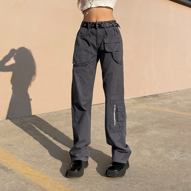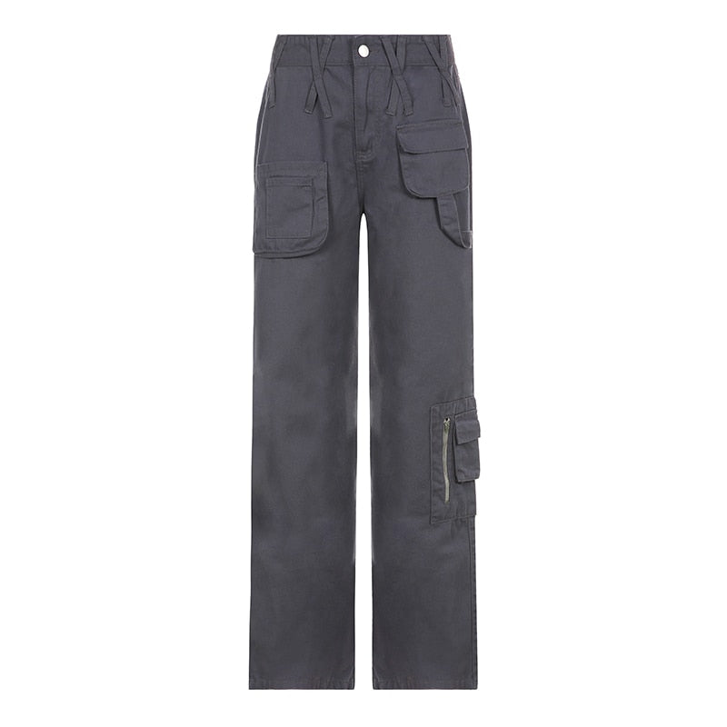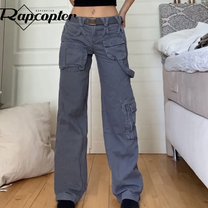 Rapcopter y2k Vintage Grey Cargo Jeans Ppockets Zipper Bandage Solid Trousers Fashion Baggy Streetwear Sweatpants Women Korean
