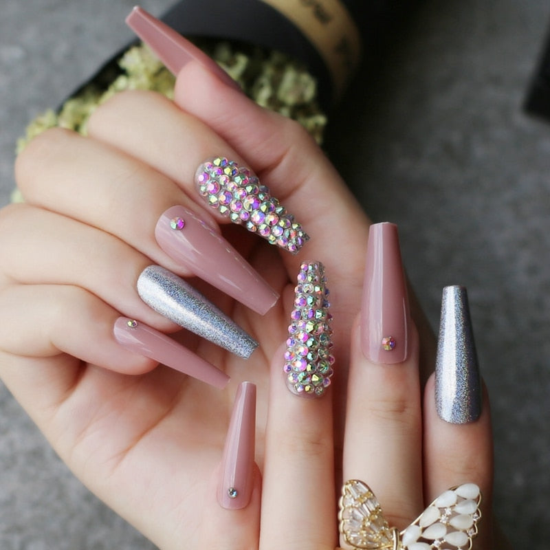 Rhinestone crystal design Pink Luxury Ombre extra Coffin Press on nails Gel Abstract smudge art crystal fake nails Custom logo-Nail Inspo
