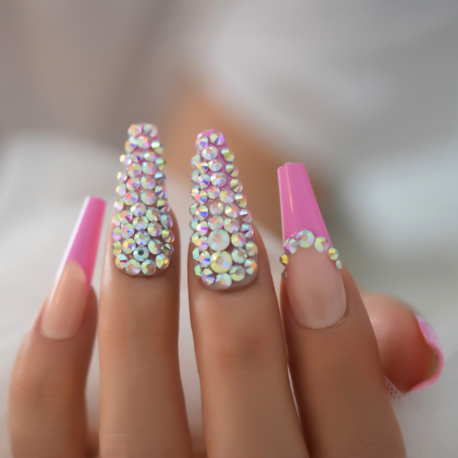 Rhinestones Nail Press Ons Extra Long Coffin 3d Designed Fake Nails Jewel Luxury Rosy Nude Royalty False Nail Tips-Nail Inspo