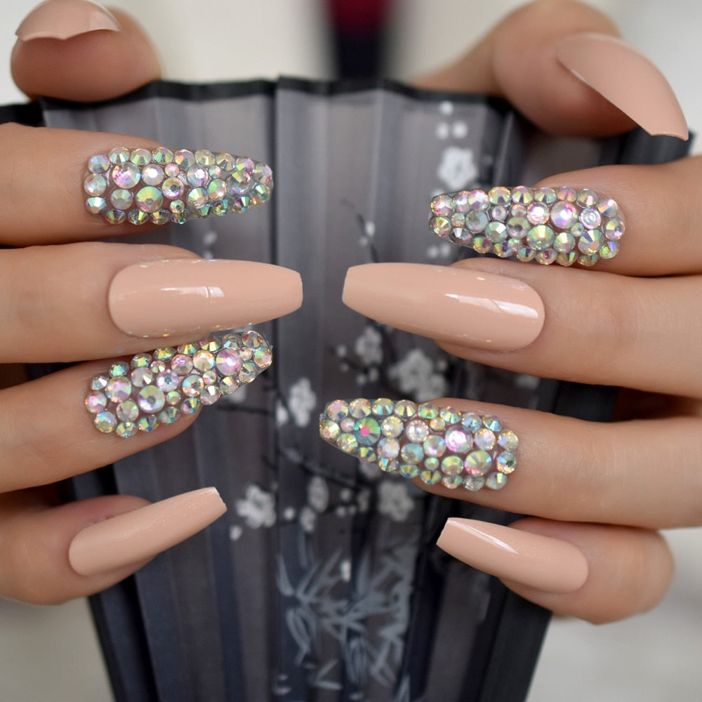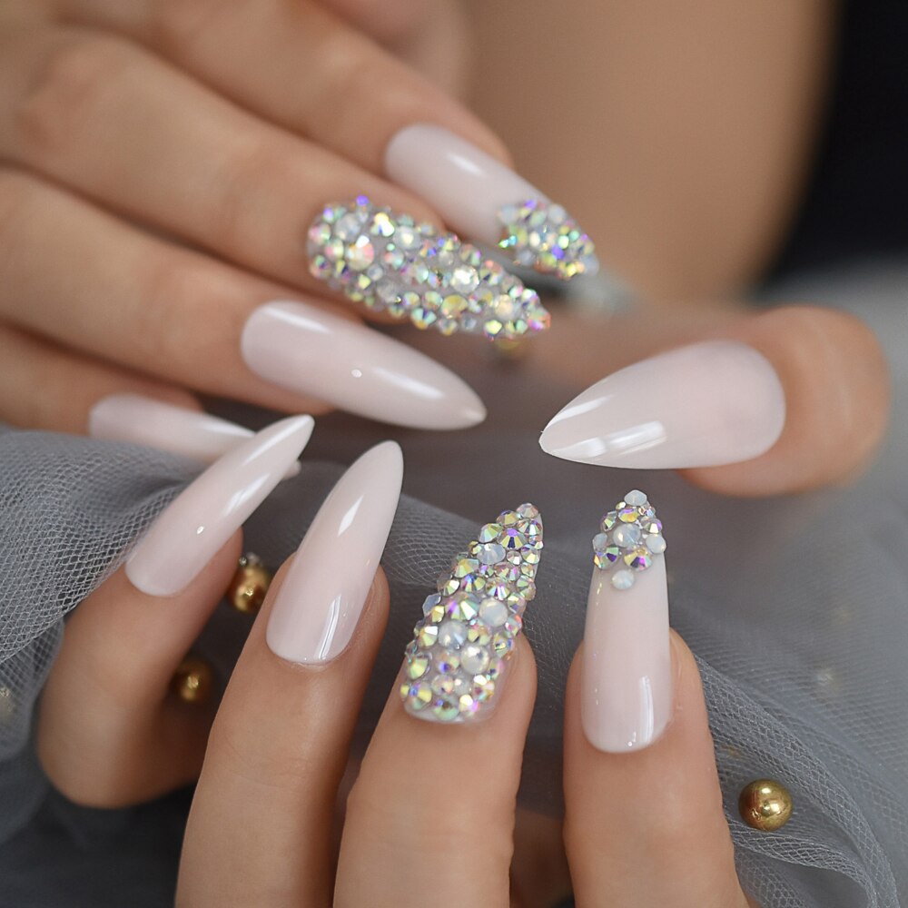 Salon Perfect Artificial Nails 3D Rhinestones Decorative White Nude Faux Ongles Long Ballerina Trapezoid Tips-Nail Inspo