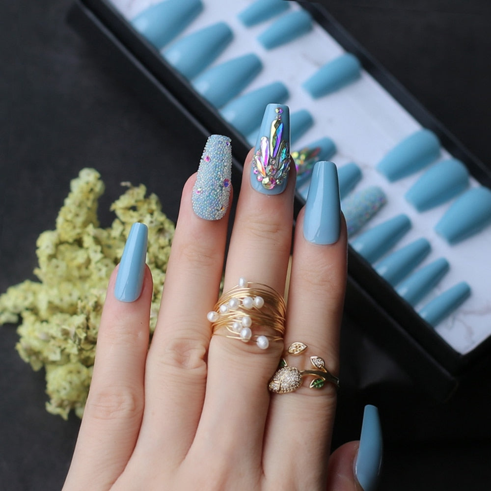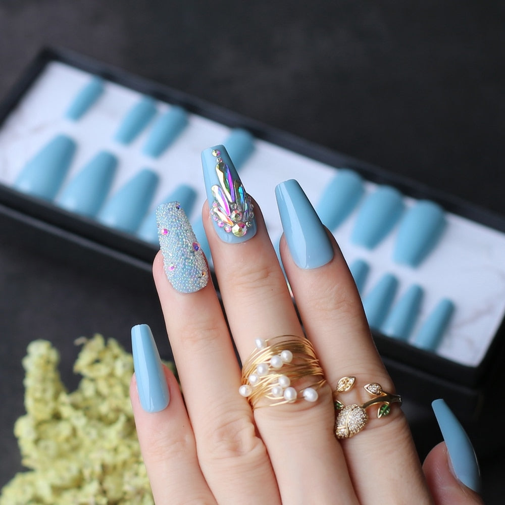 Sky blue fake nails summer nail crystal sparkling coffin Acrylic nails diamond Luxurious caviar-Nail Inspo