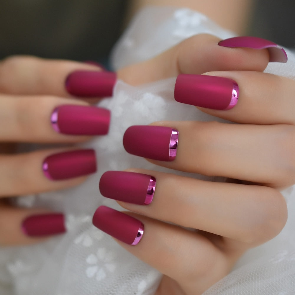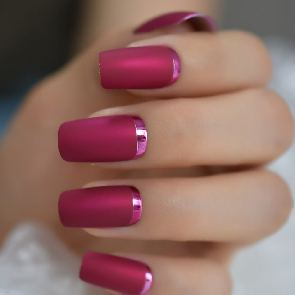 Slim Square Fake Nails Matte Rose Red with Metallic Moo Medium Size Frosted Artificial Acrylic Nail Art Tips with Glue sticker-Nail Inspo