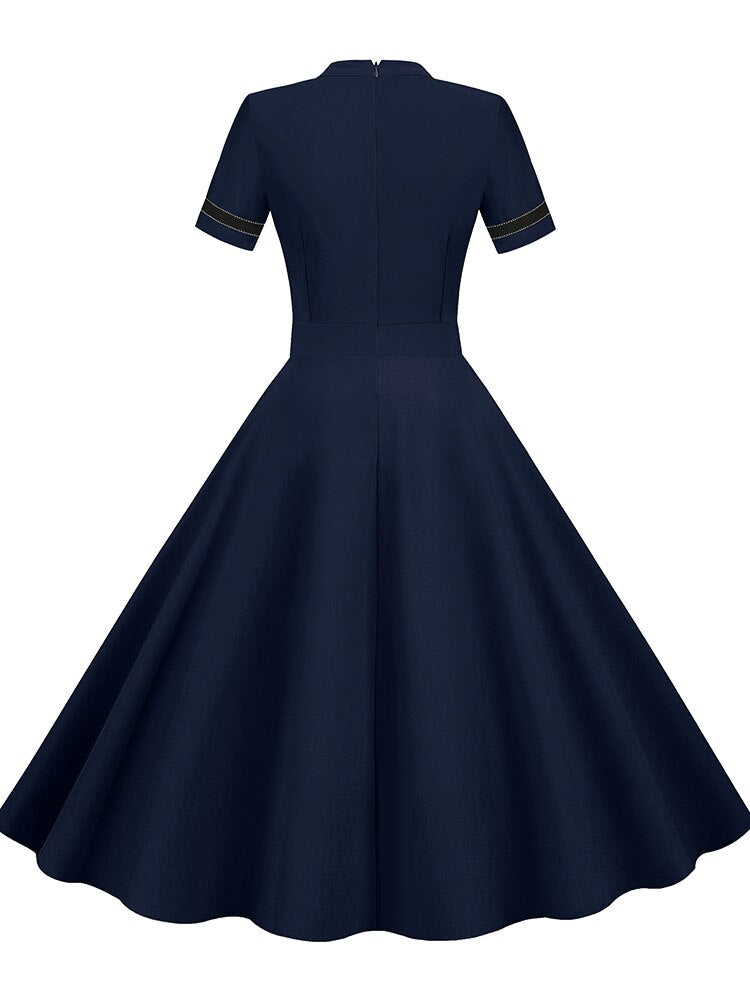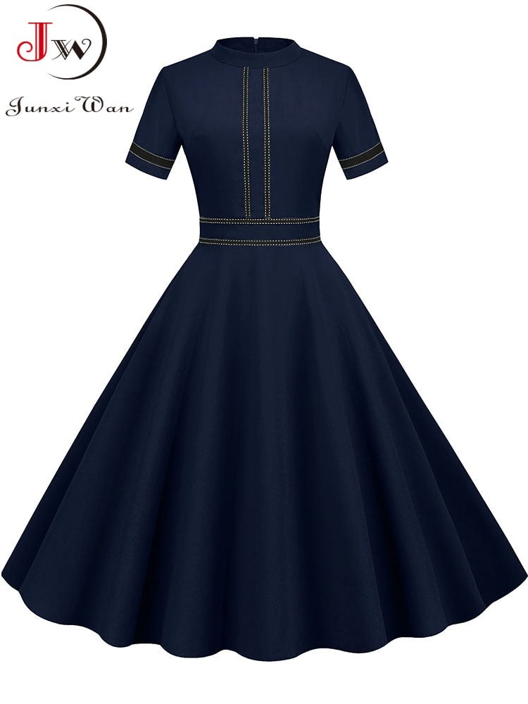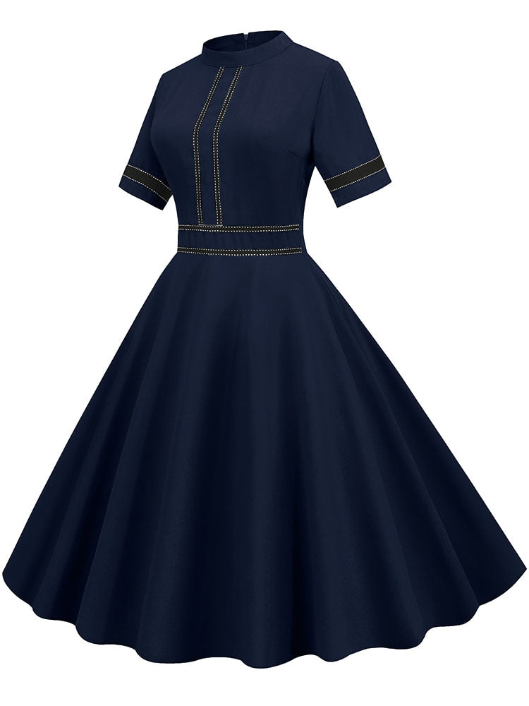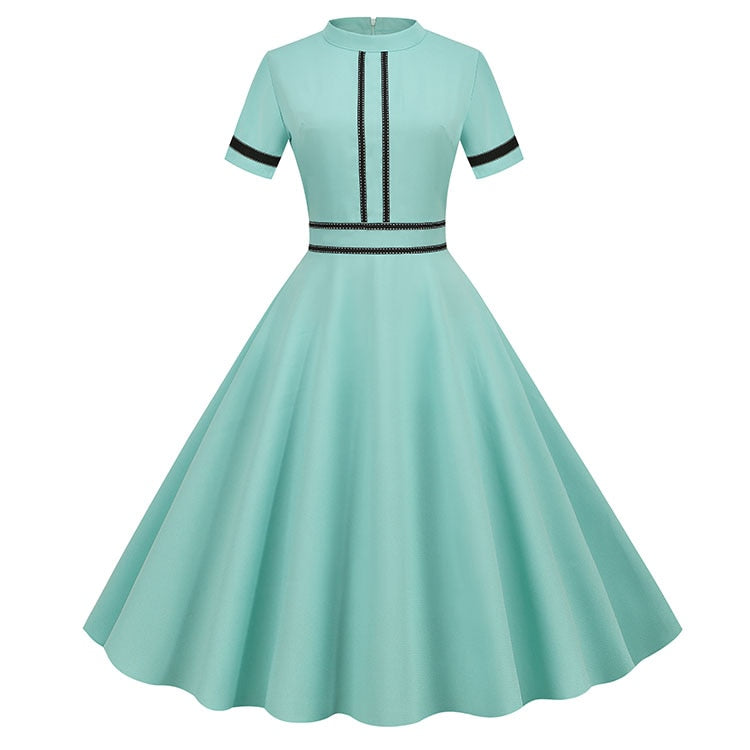 Solid Women Summer Dress Elegant Short Sleeve Stand Collar Vintage A-line Midi Long Office Party Sundress Robe