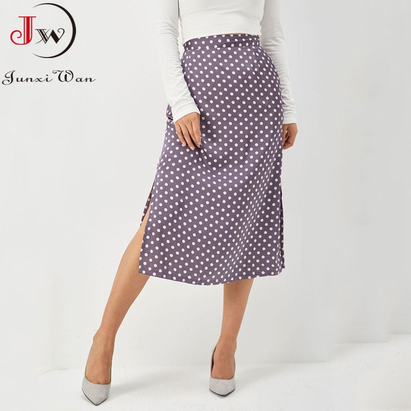 Spring Summer Slim Split Satin Skirt Women High Waist Zipper Polka Dot Bodycon Long Skirts Elegant Chic Office Party Clothing