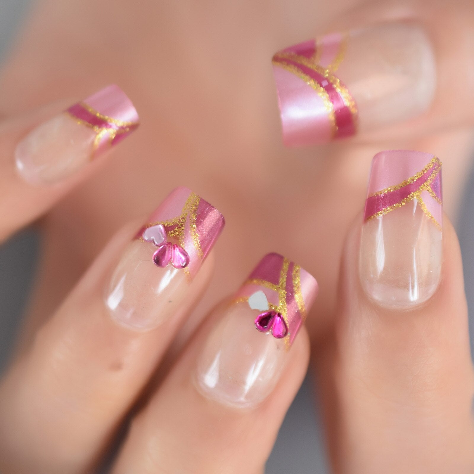 Square Clear Press On Nails French Tips Kit Medium Natural False Nails Design Crystal Rosy Collar Gel Nail-Nail Inspo