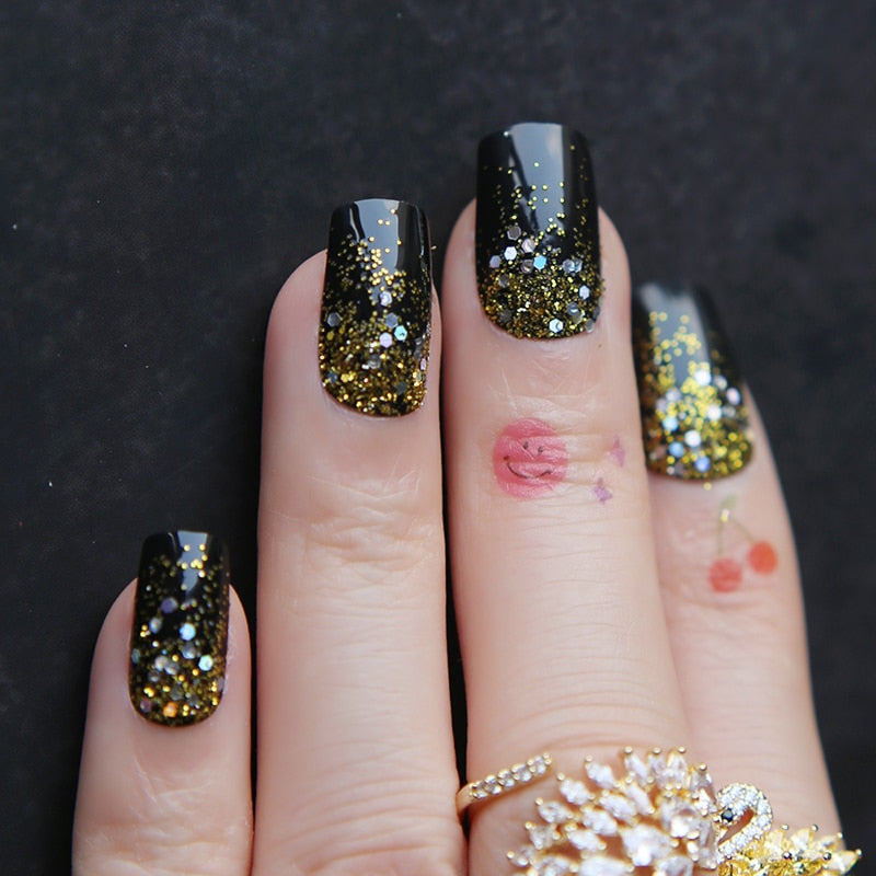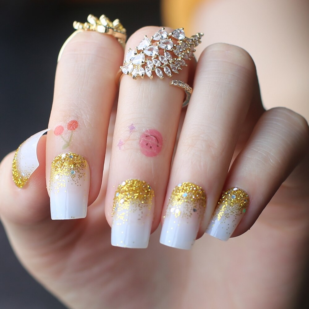 Square rectangular Natural acrylic false nails Ombre Glitter Beige Fake nails Art Golden glitter-Nail Inspo