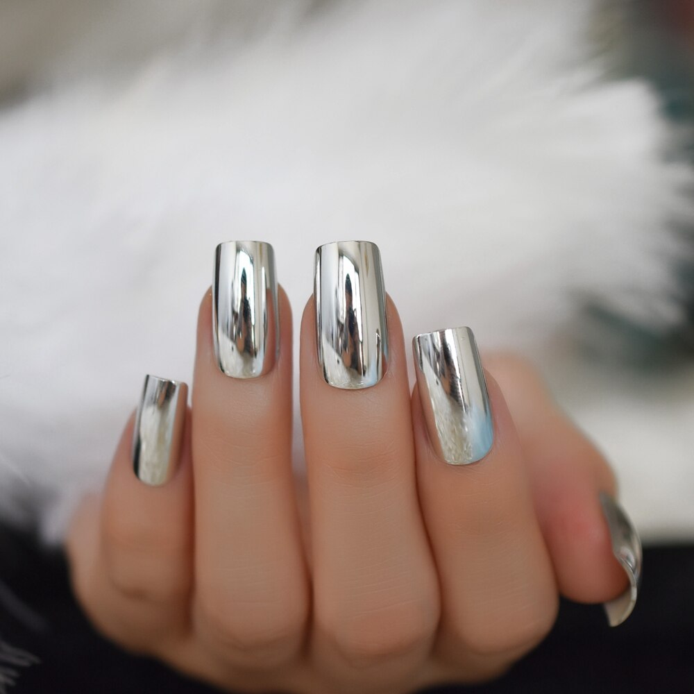 Square Top Fake Nails Medium Flat Classical Silver Mirror False Nails Quality Manicure Tips with Adhesive Sticker 24-Nail Inspo