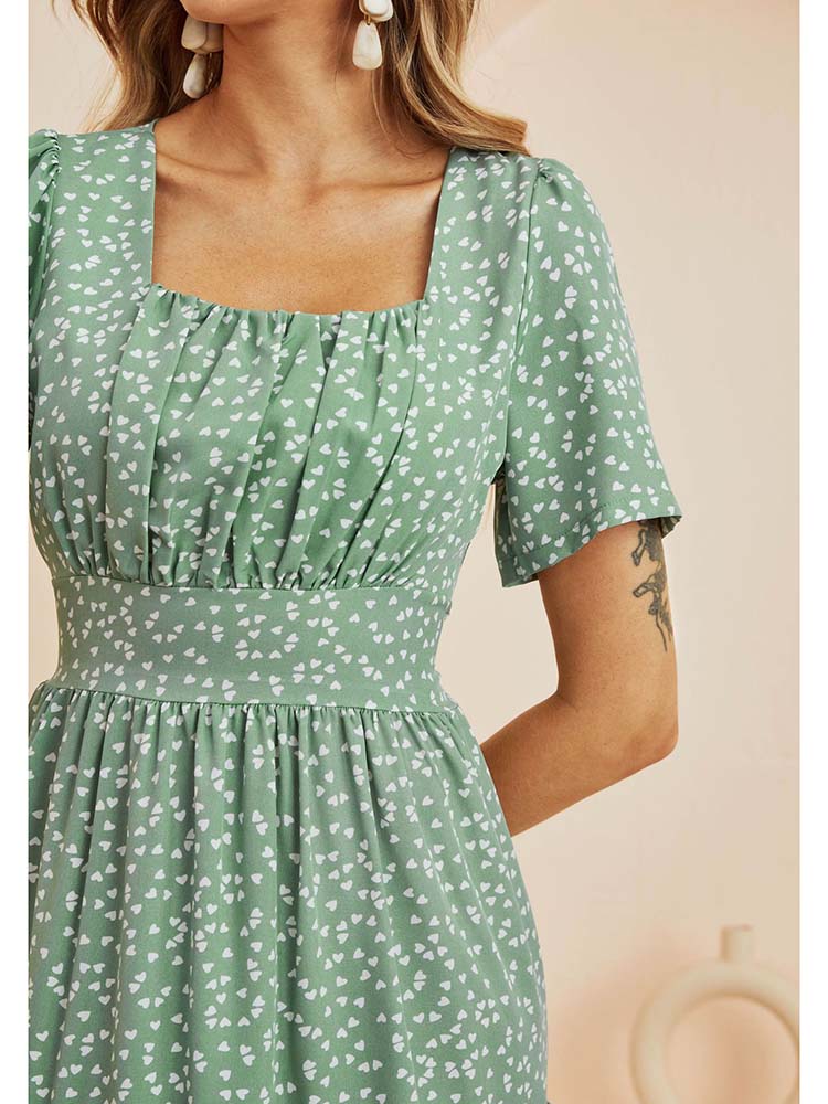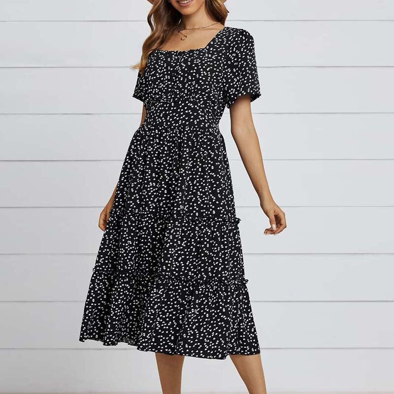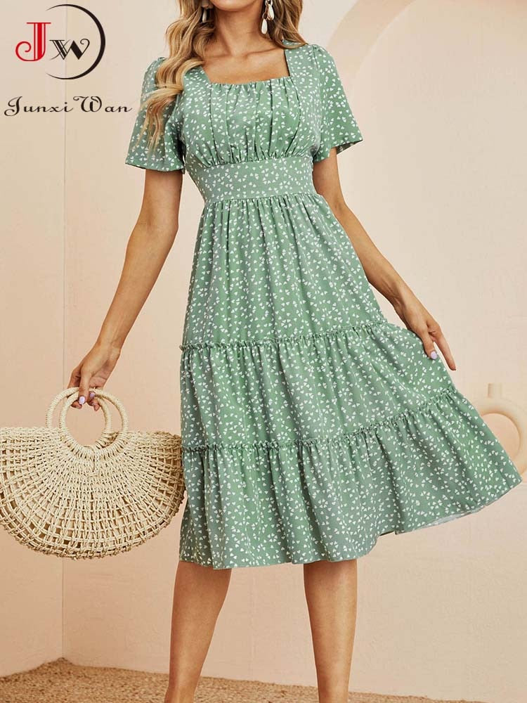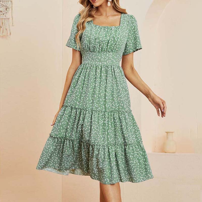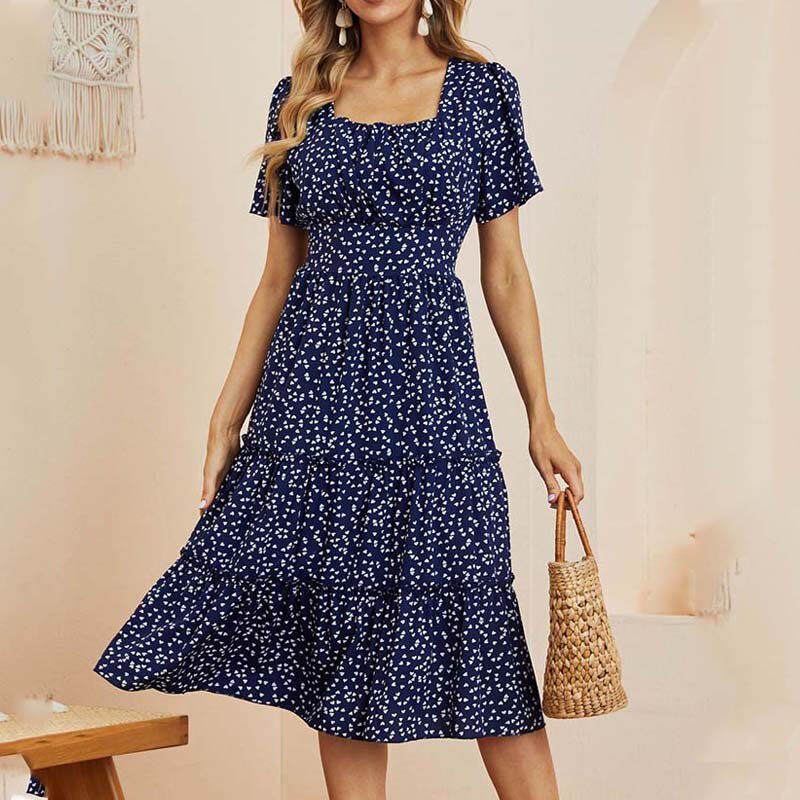 Summer Dress Women Short Sleeve High Waist Floral Print Midi Dress Casual Elegant Square Collar Holiday Beach clothes