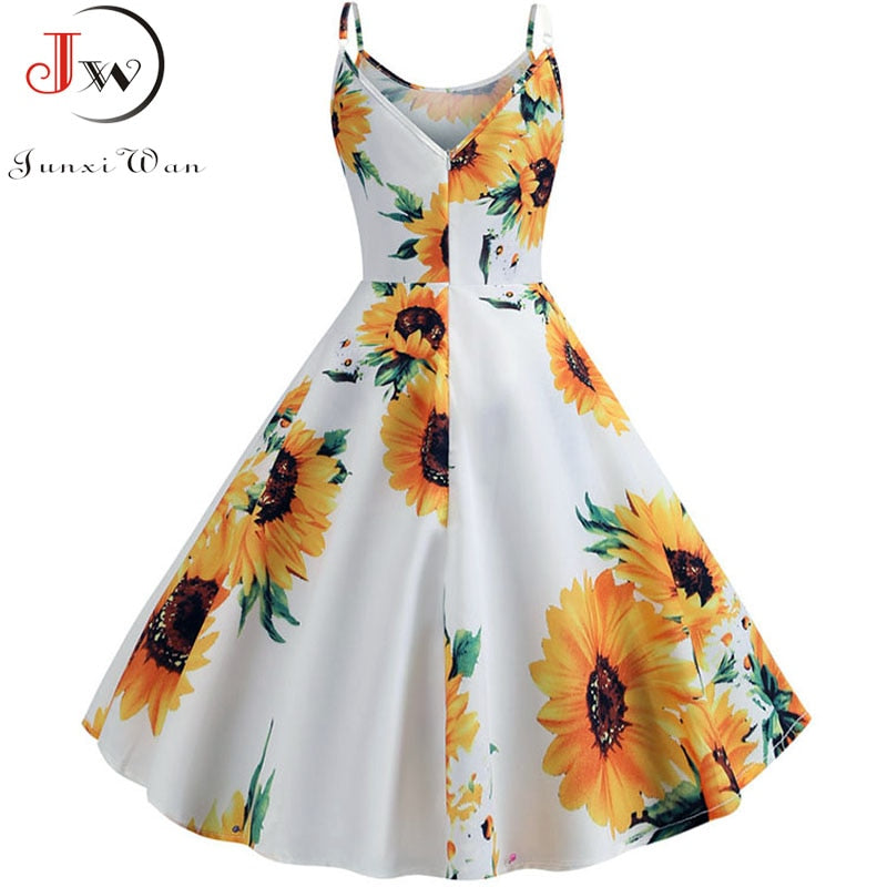 Summer Women Dress  Sexy Sunflower Print Tunic Beach Dress Sundress White Spaghetti Strap Swing Vintage Rockabilly Dresses