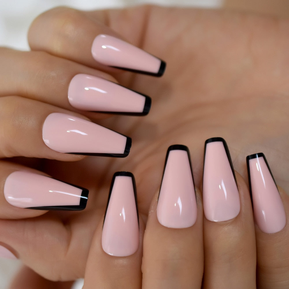 Trapezoid French Nail Nude Pink Color False Nails Black Top Long Tapered Coffin Nail Art Tips Thick Reusable with Adhesive Tabs-Nail Inspo