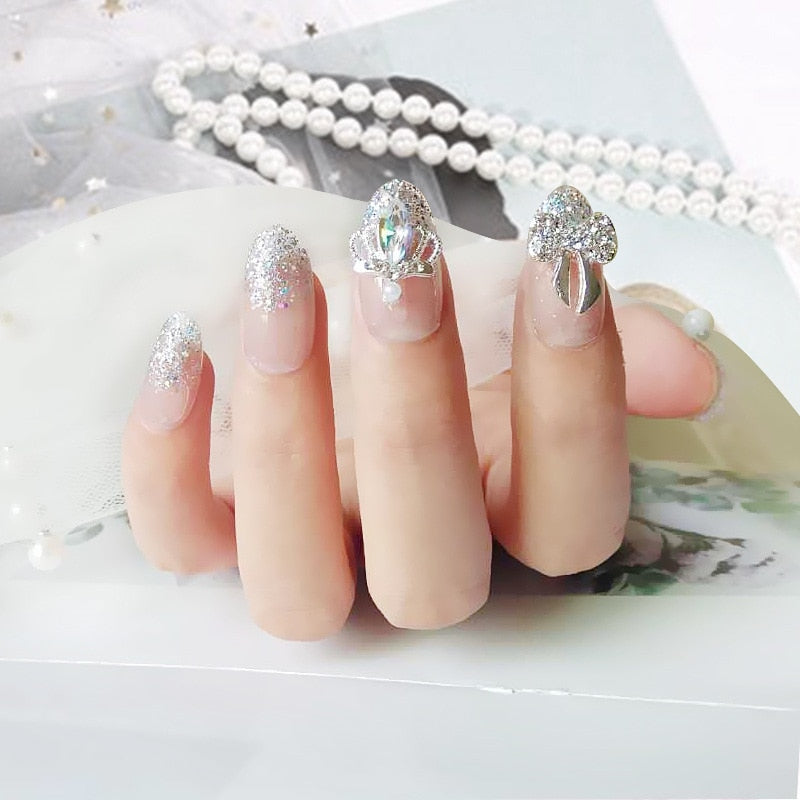 Wedding Beauty Fake Nails DIY Glitter Acrylic Full Cover Nail Art Tips with Glue Girls Shining Rhinestones Fashion False Nail-Nail Inspo