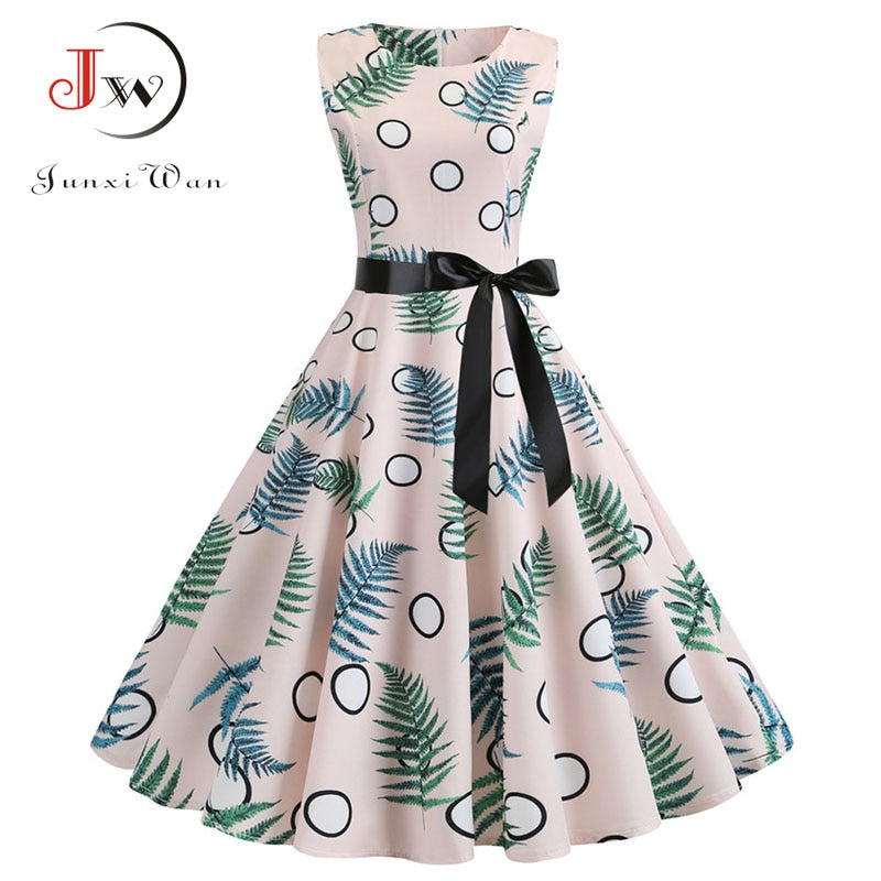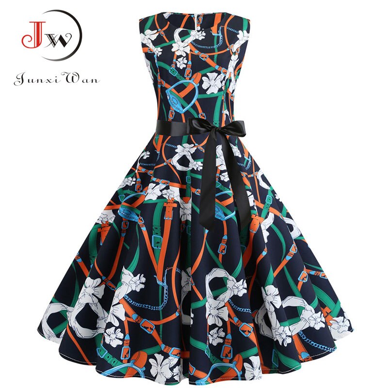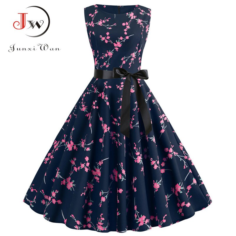 White Floral Print Women Summer Dress Sleeveless Elegant Vintage Party with Belt 50s 60s Robe Femme Casual Midi Dress